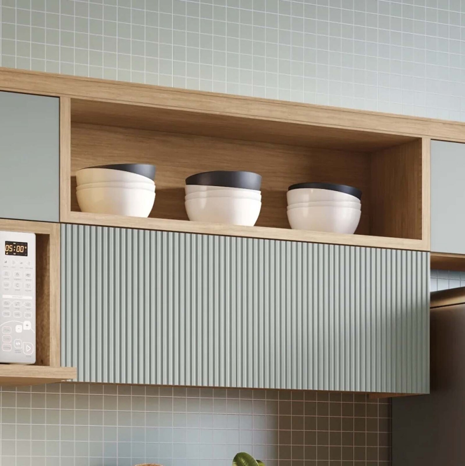 "Nuestra línea de cocina modulada Berna, construida 100% en MDF, fue diseñada para combinar funcionalidad y estilo en tu hogar. Su aéreo de 120 cm ofrece una solución completa para tus necesidades de almacenamiento en la cocina. Tienes la opción de elegir entre dos colores: gris para combinar con los bajos mesadas, o natural para añadir un toque diferencial al ambiente."