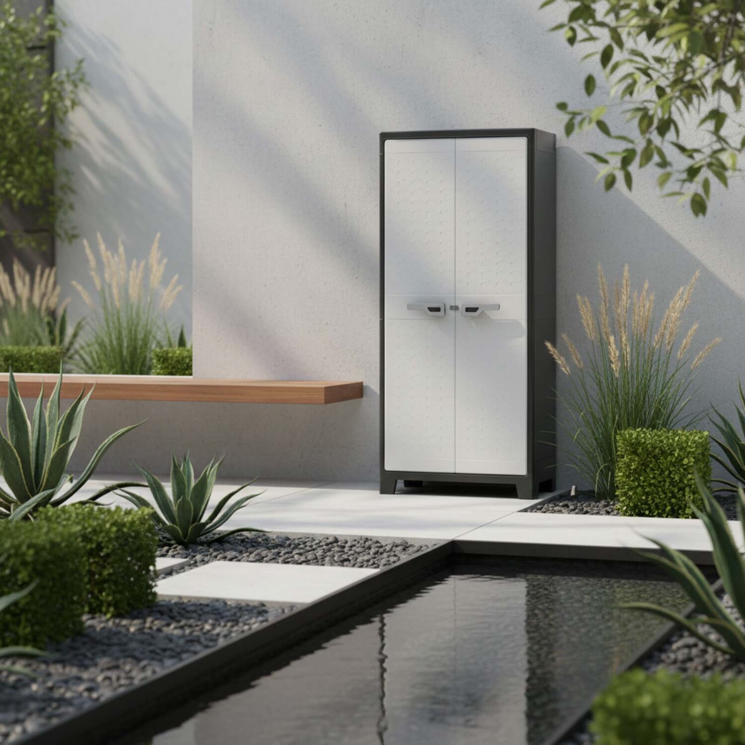 Armario alto Keter de la línea TITAN, fabricado con más de un 70% de plástico reciclado. Incluye 4 estantes ajustables que soportan hasta 30kg cada uno. Resistente al agua (Con certificación IPX3) y viento, herrajes de metal, certificado TUV GS. La resistencia a la lluvia, el fondo reforzado y el cierre con preparación para candado (no incluido) proporcionan la máxima seguridad. Una excelente solución de almacenamiento que combina diseño y funcionalidad. De fácil limpieza y montaje.