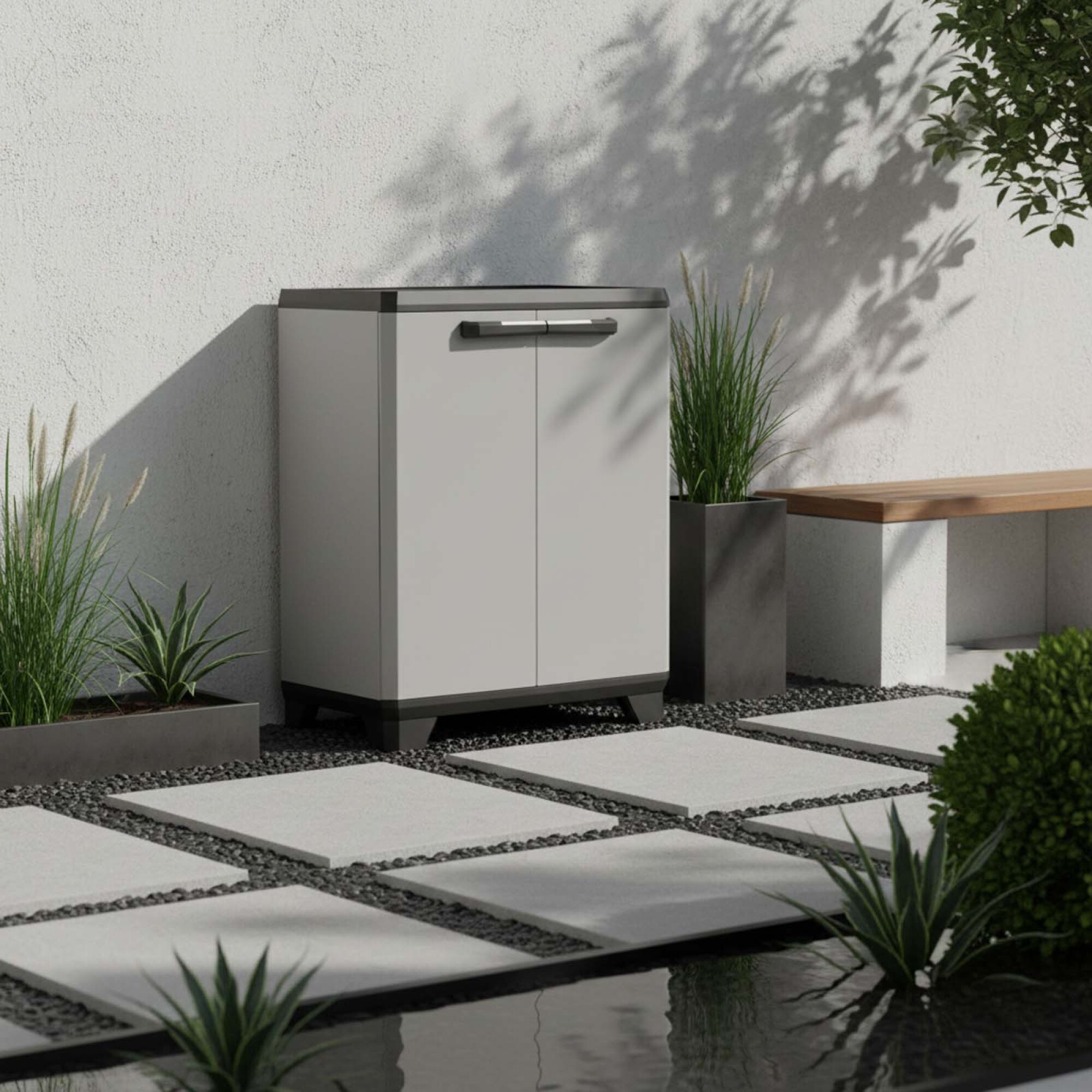Armario base Keter de la línea PLANET, fabricado con más de un 80% de plástico reciclado. Es una solución de almacenaje que reúne diseño, innovación y funcionalidad. Incluye 1 estante ajustable que soporta hasta 15kg. Mangos suaves al tacto en color negro de diseño ergonómico preparados para cierre con candado (no incluido). De fácil limpieza resistente a cualquier clima.
