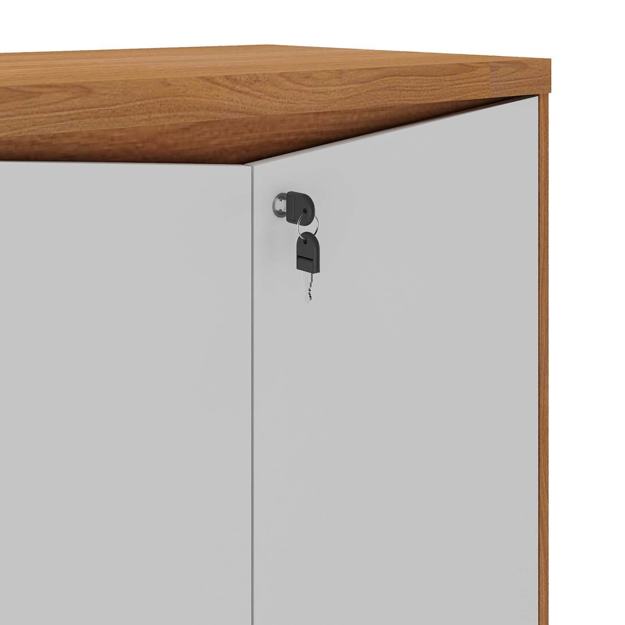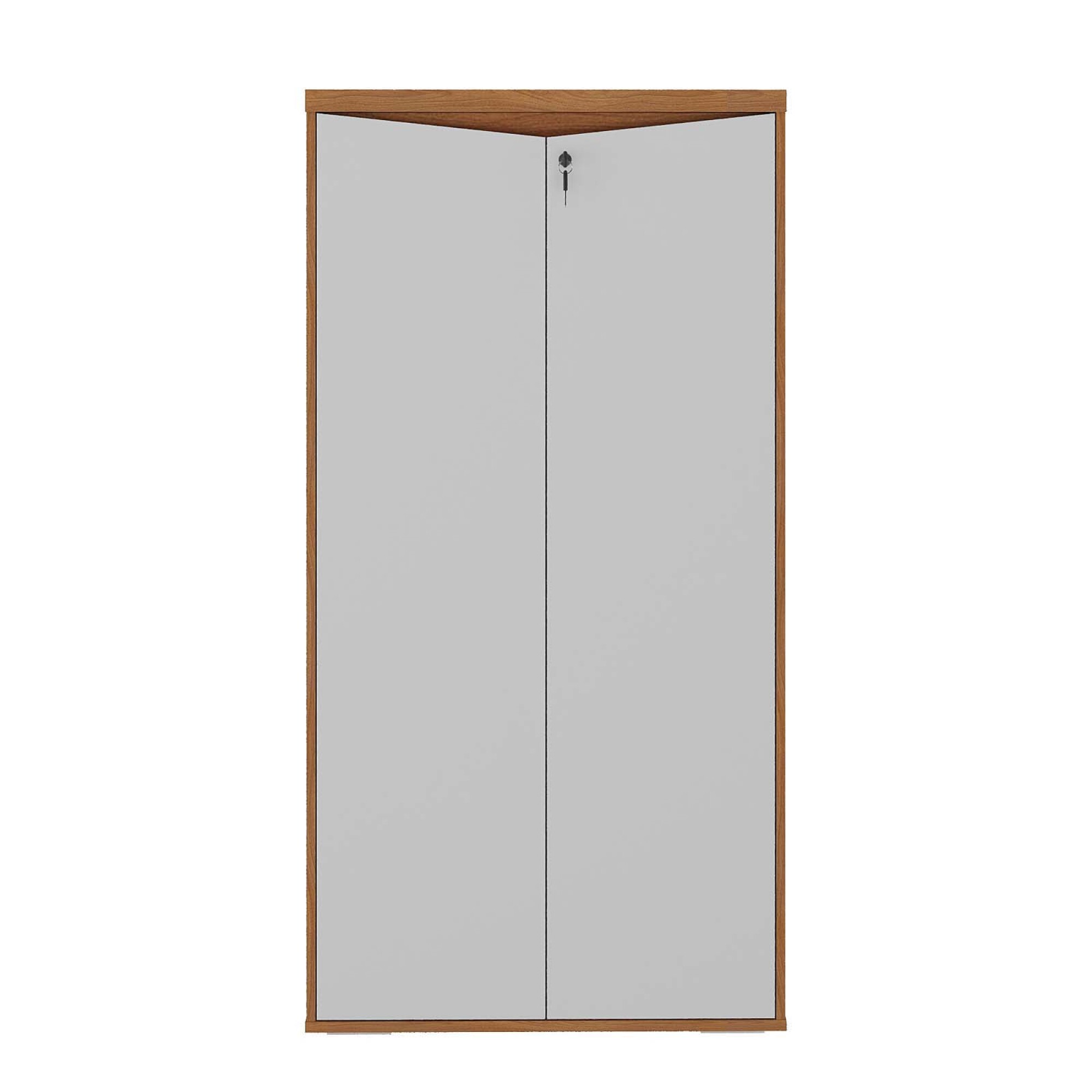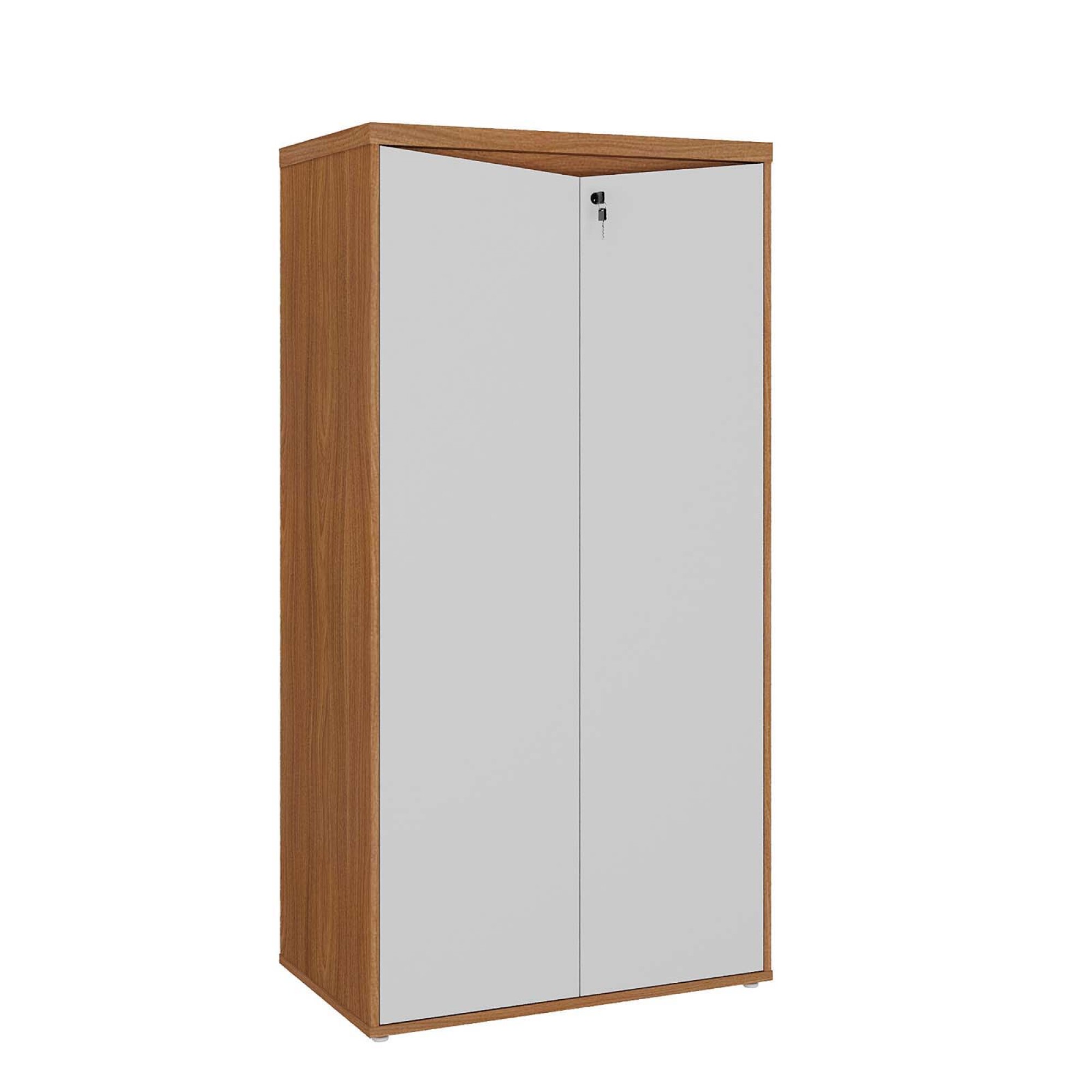 Armario alto de oficina hecho en MDF, tiene 2 puertas abatibles bloqueables con llave. Posee tapones antidelizantes en las patas para evitar daños por arrastre. Forma parte de la línea corporativa YMIR.