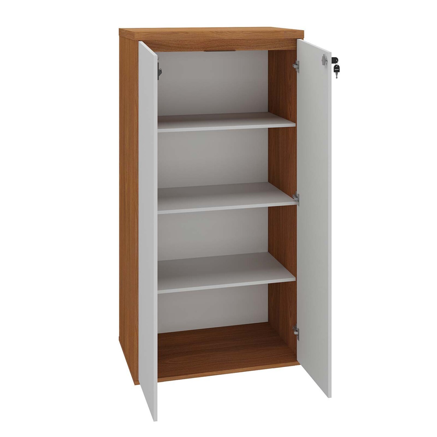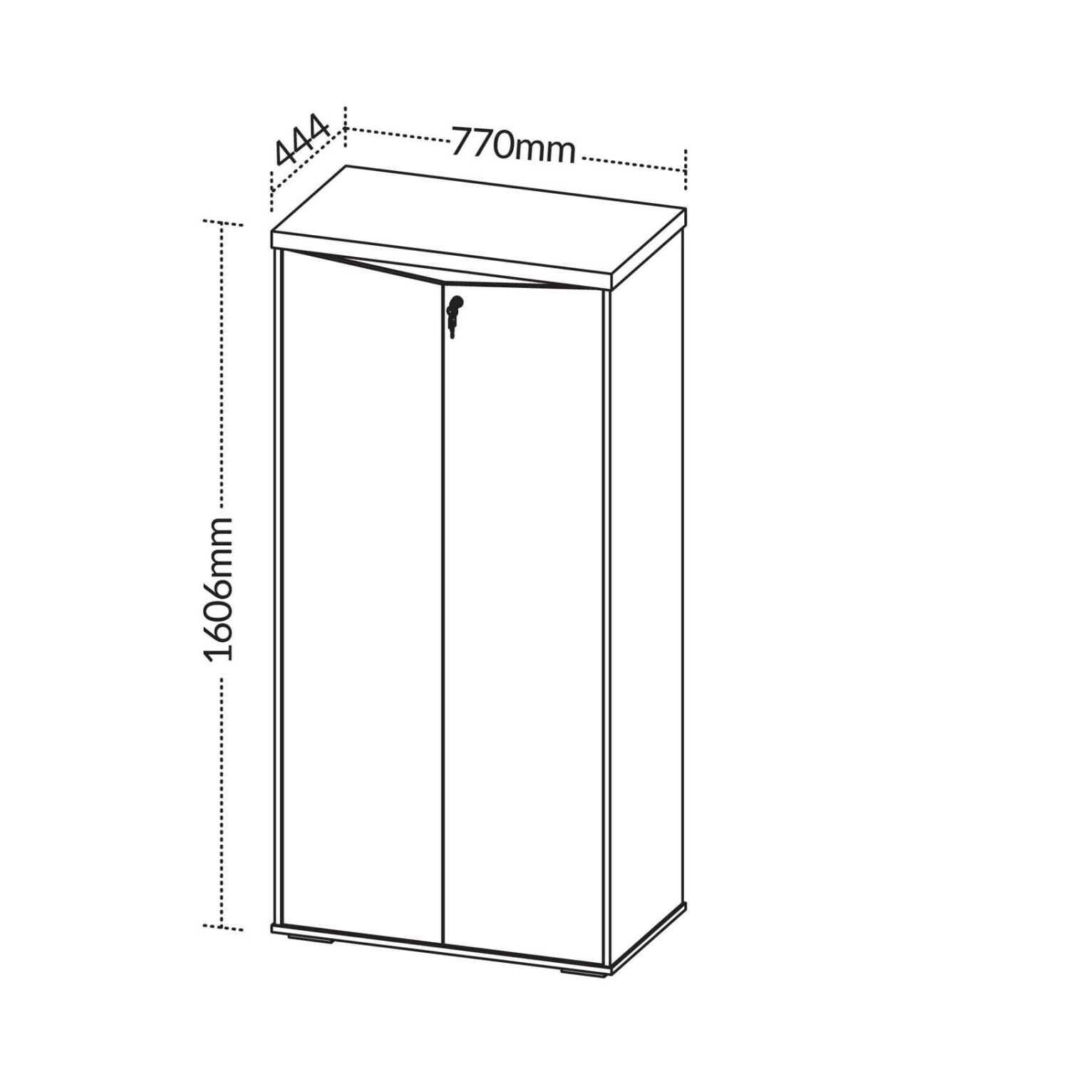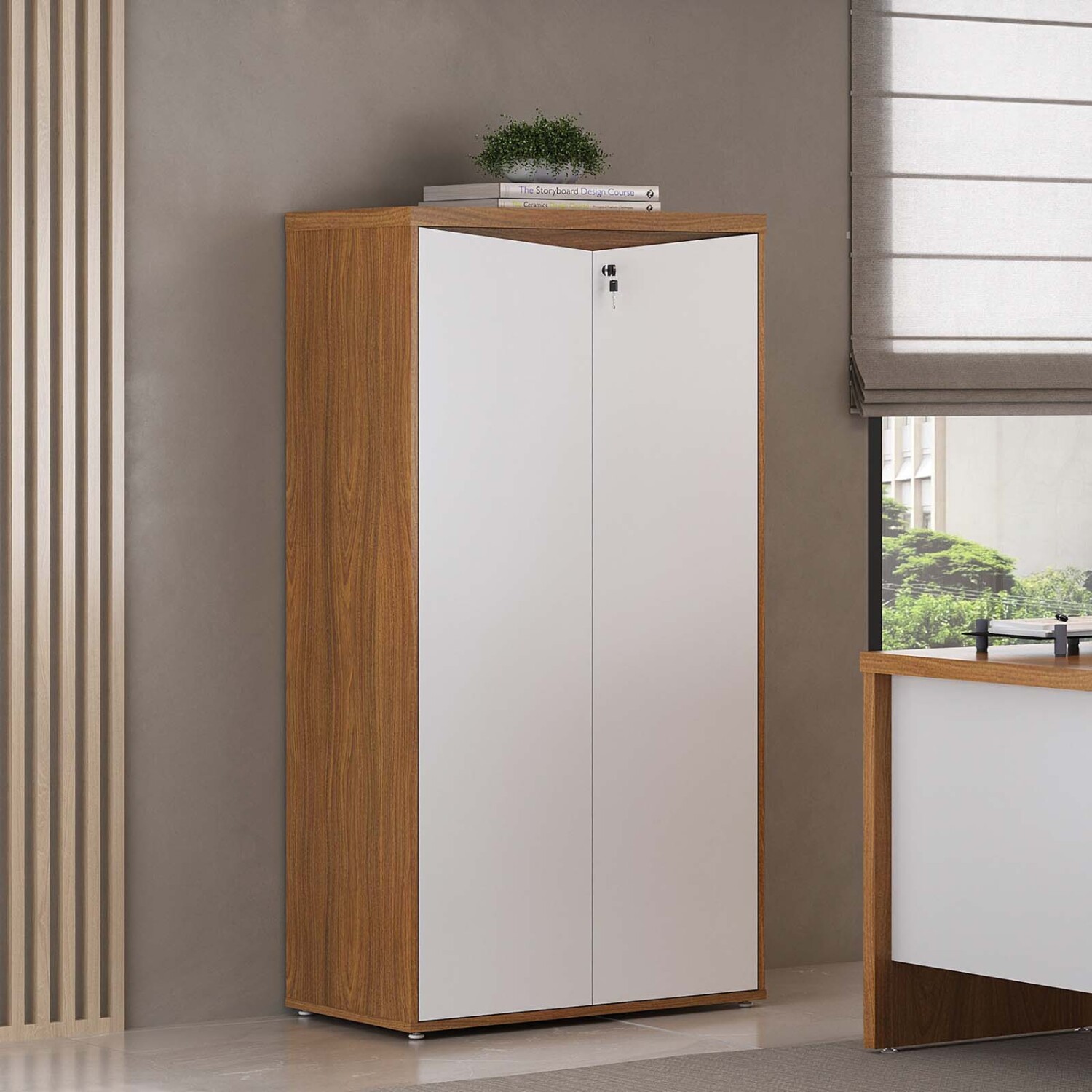 Armario alto de oficina hecho en MDF, tiene 2 puertas abatibles bloqueables con llave. Posee tapones antidelizantes en las patas para evitar daños por arrastre. Forma parte de la línea corporativa YMIR.