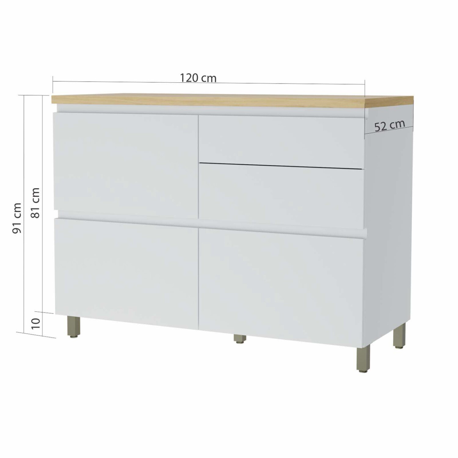 Nuestra línea de cocinas moduladas Suecia, construida 100% en MDF, fue diseñada para combinar funcionalidad y estilo en tu hogar. Su bajo mesada de 120 cm es una pieza central de esta colección, que ofrece una solución completa para tus necesidades de almacenamiento en la cocina. Equipado con tres cajones y dos puertas basculantes, una de ellas especialmente diseñada para almacenar tus condimentos. Los rieles telescópicos facilitan la extracción total de los cajones, proporcionando un acceso cómodo y sin esfuerzo. Incluye tapa de bajo mesada 100% MDF (no apta para la instalación de piletas). Se debe evitar el contacto directo con líquidos para garantizar una mayor durabilidad del producto. La exposición prolongada a la humedad puede ocasionar daños en el MDF. Completa el módulo con su zócalo a juego, disponible para su compra por separado (Código: 273638).