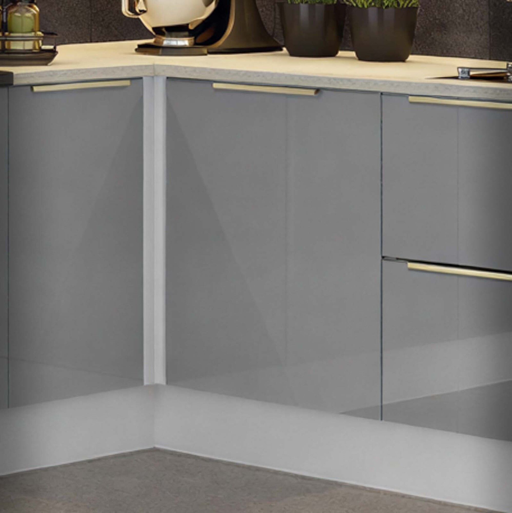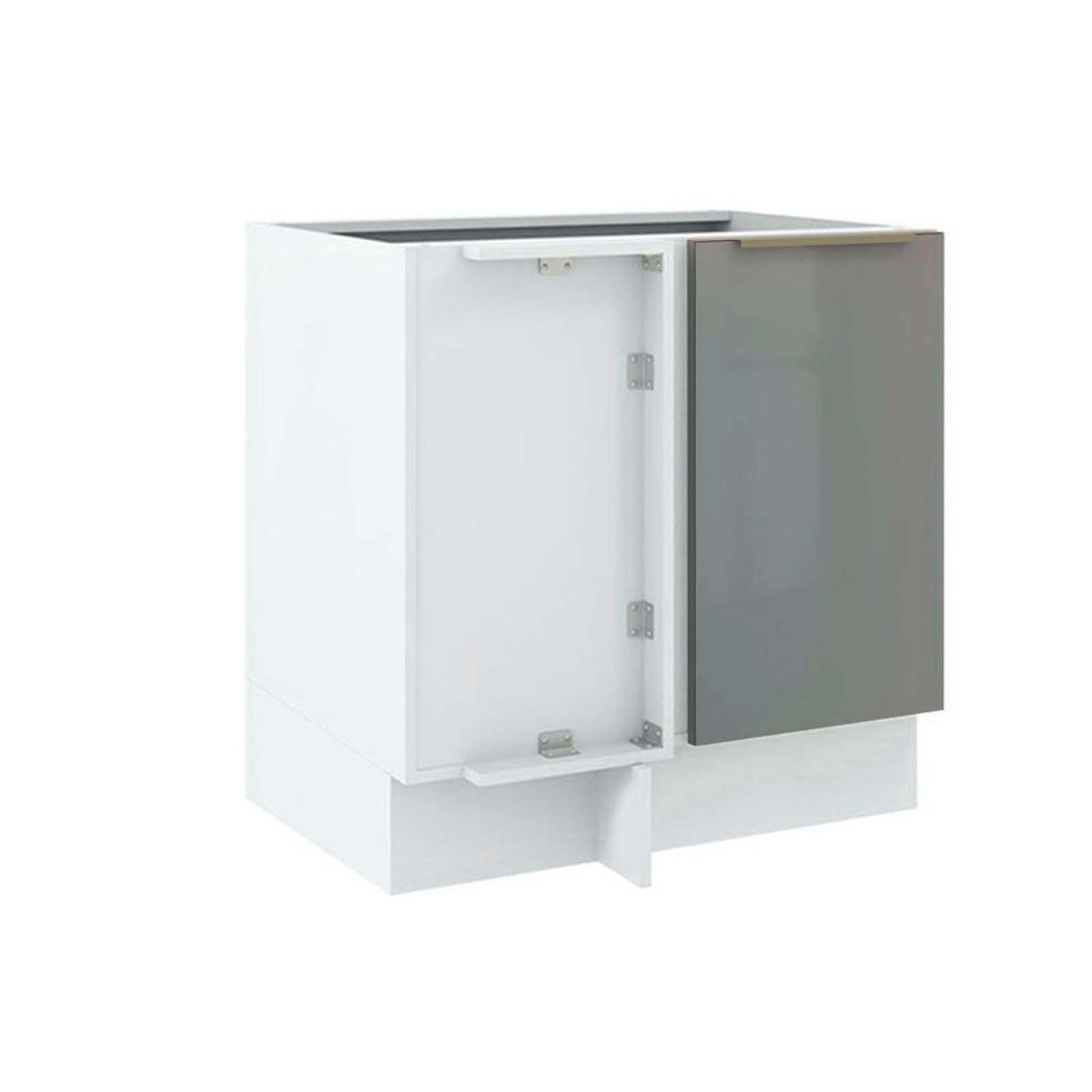 Bajo mesada esquinero en MDP de 15mm y 18mm con acabado en pintura poliester de alta resistencia. 1 puerta de vidrio de cierre con freno. Tiradores en aluminio, pies con ajuste de altura de 150-200 mm, y visagras metalicas de 36mm. Incluye zócalo. Apto para mesadas de granito o silestone.