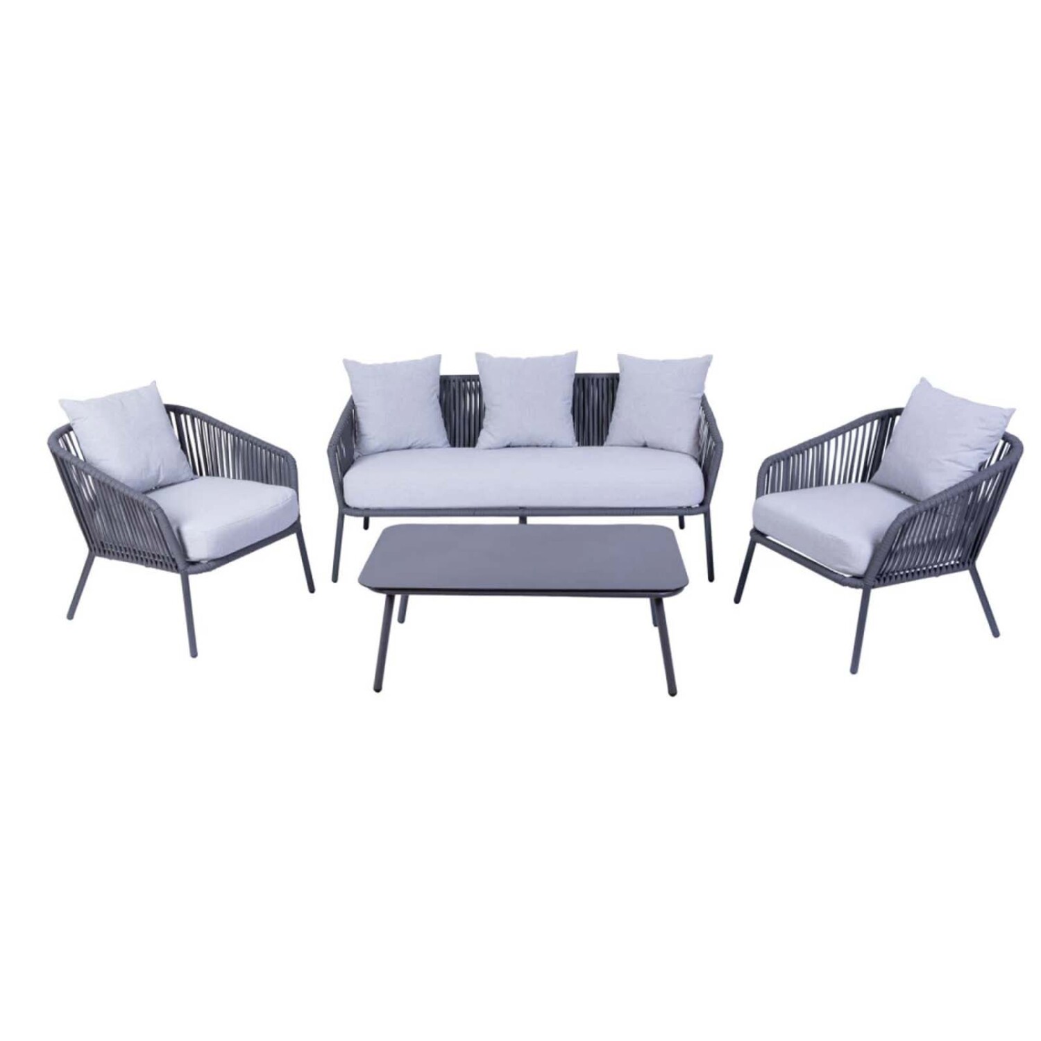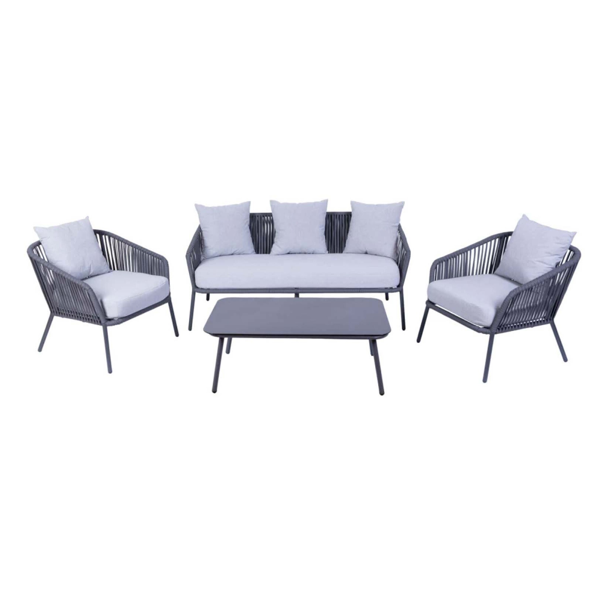 Dale un nuevo aire a tu espacio exterior con el set de living BAYAHIBE, diseñado para brindarte comodidad y estilo. Su estructura de aluminio, ideal para exteriores por su resistencia a la corrosión y a la humedad, se complementa con detalles en cuerda, una tendencia en diseño que destaca por su estética moderna, textura visual y bajo mantenimiento. Almohadones tapizados en tela Olefin 200gr y fundas desmontables que facilitan su limpieza. El equilibrio entre diseño y confort de este set transforma tu patio en el lugar ideal para disfrutar de reuniones con amigos o momentos de descanso. Compuesto por 1 Sofa (151,5*72*70cm) - 2 Butacas (70*72*70cm) - 1 Mesa Central (100*59*37cm). Disponible también en color beige. *Cuidados y limpieza*: Su mantenimiento es sencillo. Utilizar jabón neutro, agua y paño húmedo para su limpieza. No utilizar productos abrasivos que puedan perjudicar su durabilidad. Recomendamos almacenar los almohadones en un lugar protegido durante condiciones climáticas adversas.