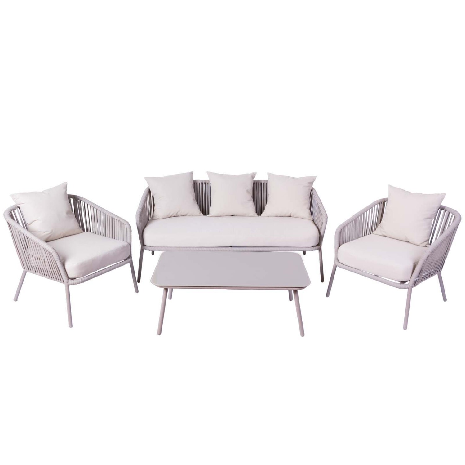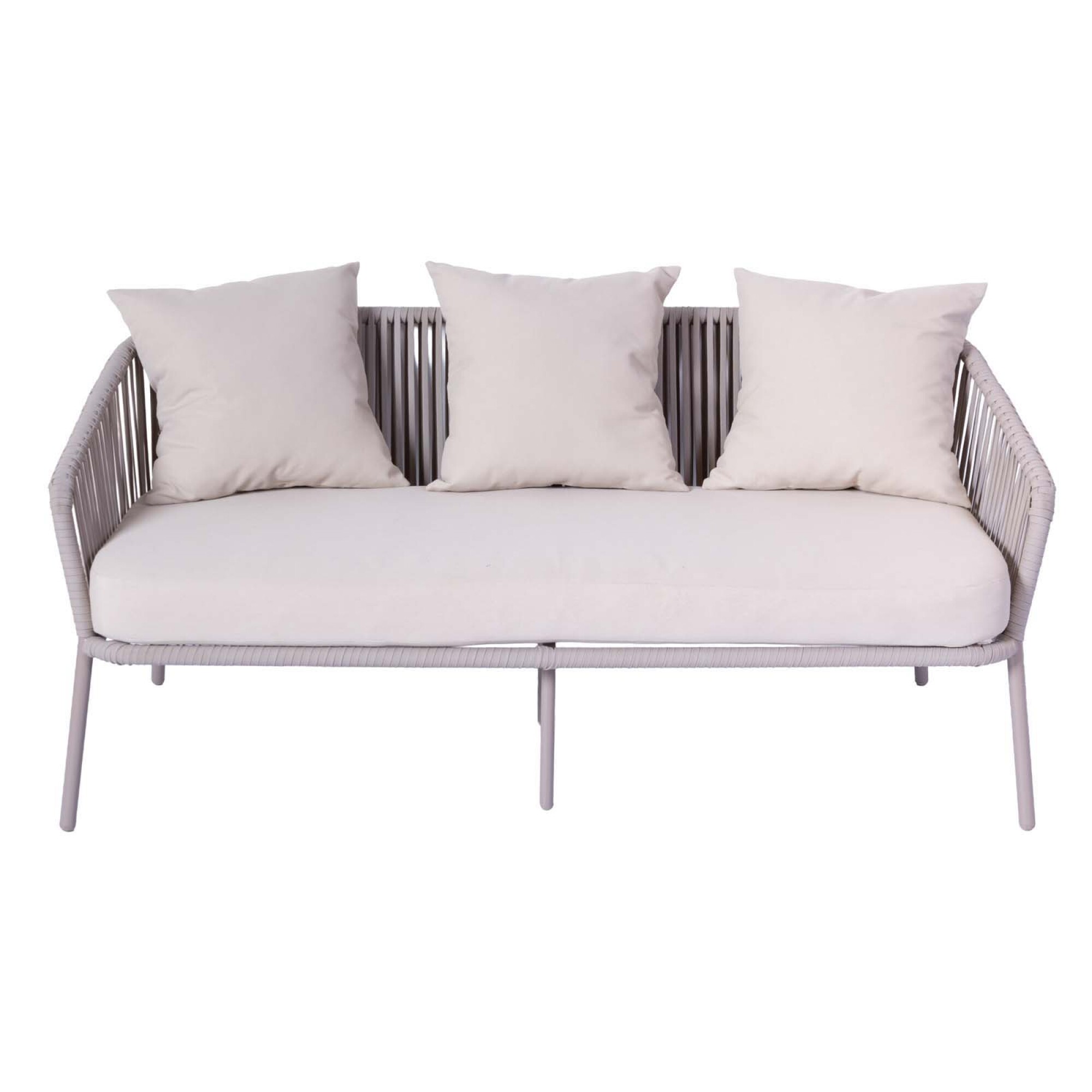 Dale un nuevo aire a tu espacio exterior con el set de living BAYAHIBE, diseñado para brindarte comodidad y estilo. Su estructura de aluminio, ideal para exteriores por su resistencia a la corrosión y a la humedad, se complementa con detalles en cuerda, una tendencia en diseño que destaca por su estética moderna, textura visual y bajo mantenimiento. Almohadones tapizados en tela Olefin 200gr y fundas desmontables que facilitan su limpieza. El equilibrio entre diseño y confort de este set transforma tu patio en el lugar ideal para disfrutar de reuniones con amigos o momentos de descanso. Compuesto por 1 Sofa (151,5*72*70cm) - 2 Butacas (70*72*70cm) - 1 Mesa Central (100*59*37cm). Disponible también en color gris.*Cuidados y limpieza*: Su mantenimiento es sencillo. Utilizar jabón neutro, agua y paño húmedo para su limpieza. No utilizar productos abrasivos que puedan perjudicar su durabilidad. Recomendamos almacenar los almohadones en un lugar protegido durante condiciones climáticas adversas.