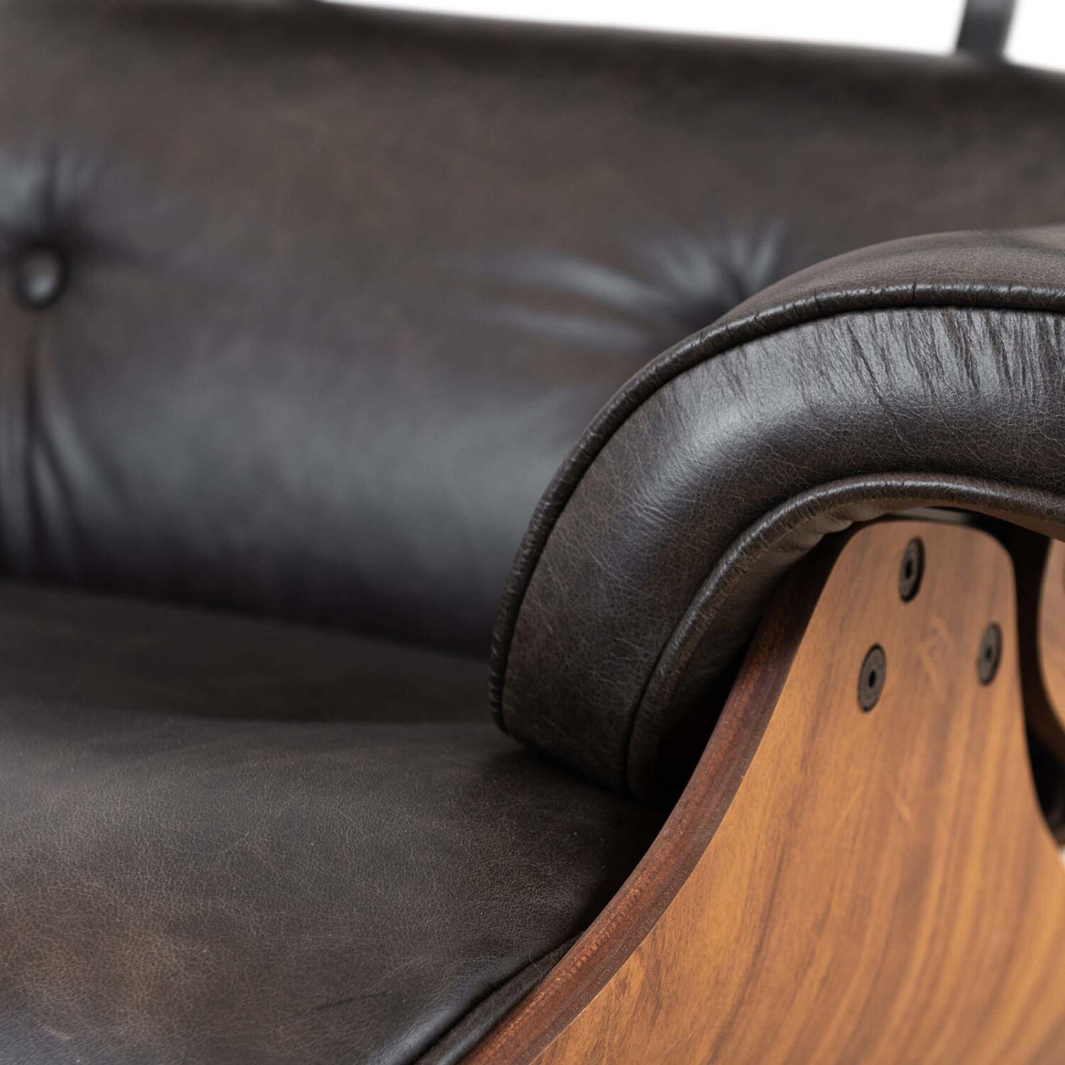 Butaca estilo EAMES, confeccionada en cuero 100% natural, con parte trasera en madera terciada y base en metal. Relleno en espuma 32 kg/m3, resortes y fibra siliconada. Medidas puff: 65x55x43 cm. 43cm de altura del piso al asiento MANTENIMIENTO: - No exponer a luz solar directa ni a fuentes de calor - No utilizar productos a base de solventes o cualquier otro producto abrasivo - La utilización de productos de limpieza inadecuados puede resecar el cuero y causar daños irreparables LIMPIEZA: - Líquidos deben ser removidos inmediatamente con un paño seco - Limpieza regular debe ser efectuada con un paño seco limpio - Para suciedades más severas utilizar un paño limpio humedecido en agua y jabón neutro