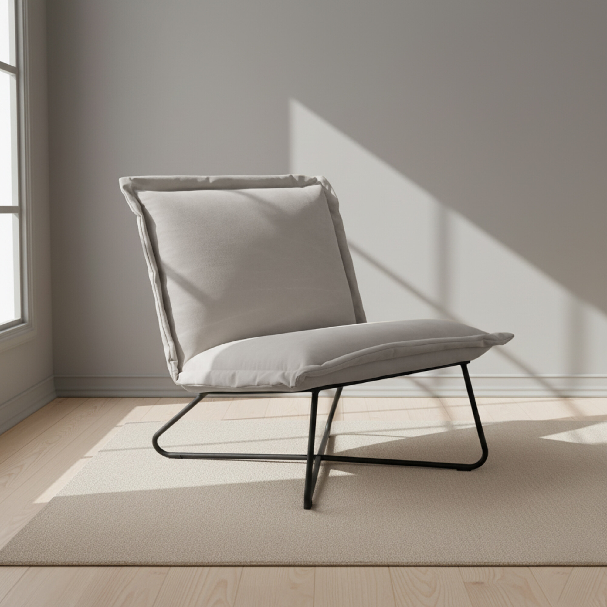 Butaca tapizada en tela 100% algodón. Relleno en espuma de alta calidad y fibra. Estructura en madera de pino y patas en metal. Peso máximo que soporta 110kgs. 44cm de altura del piso al asiento.