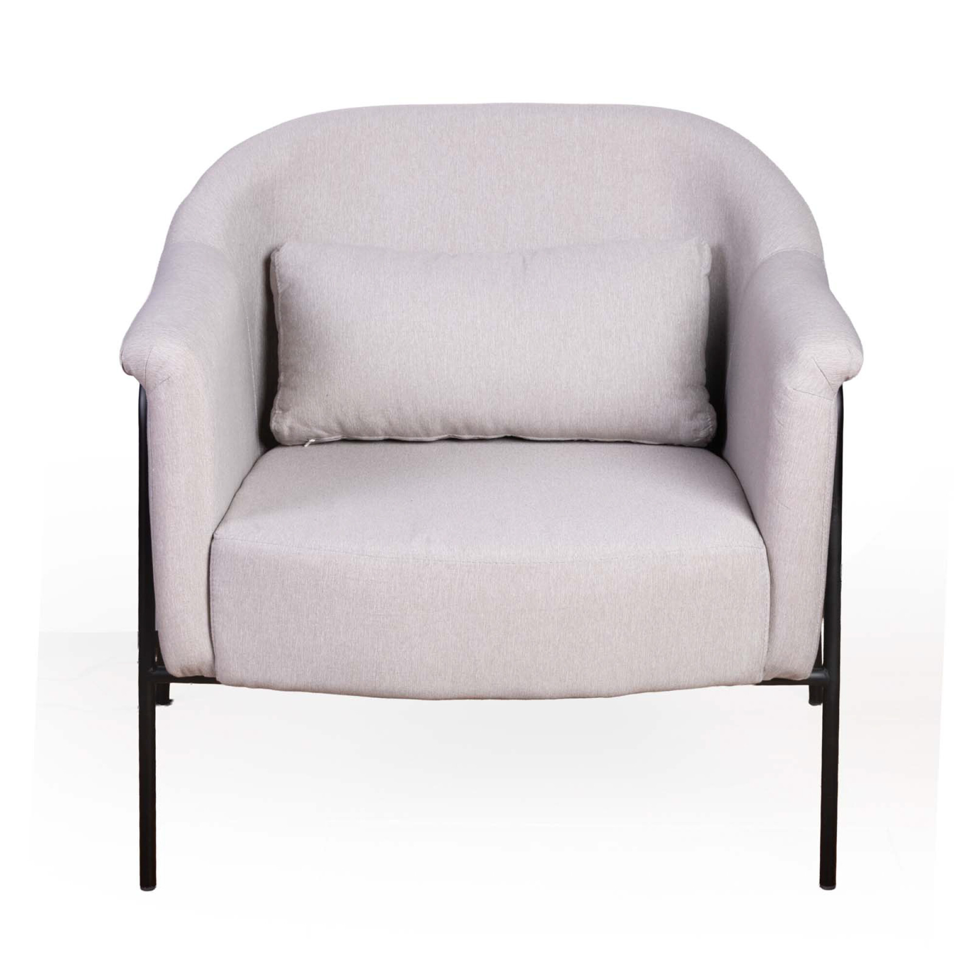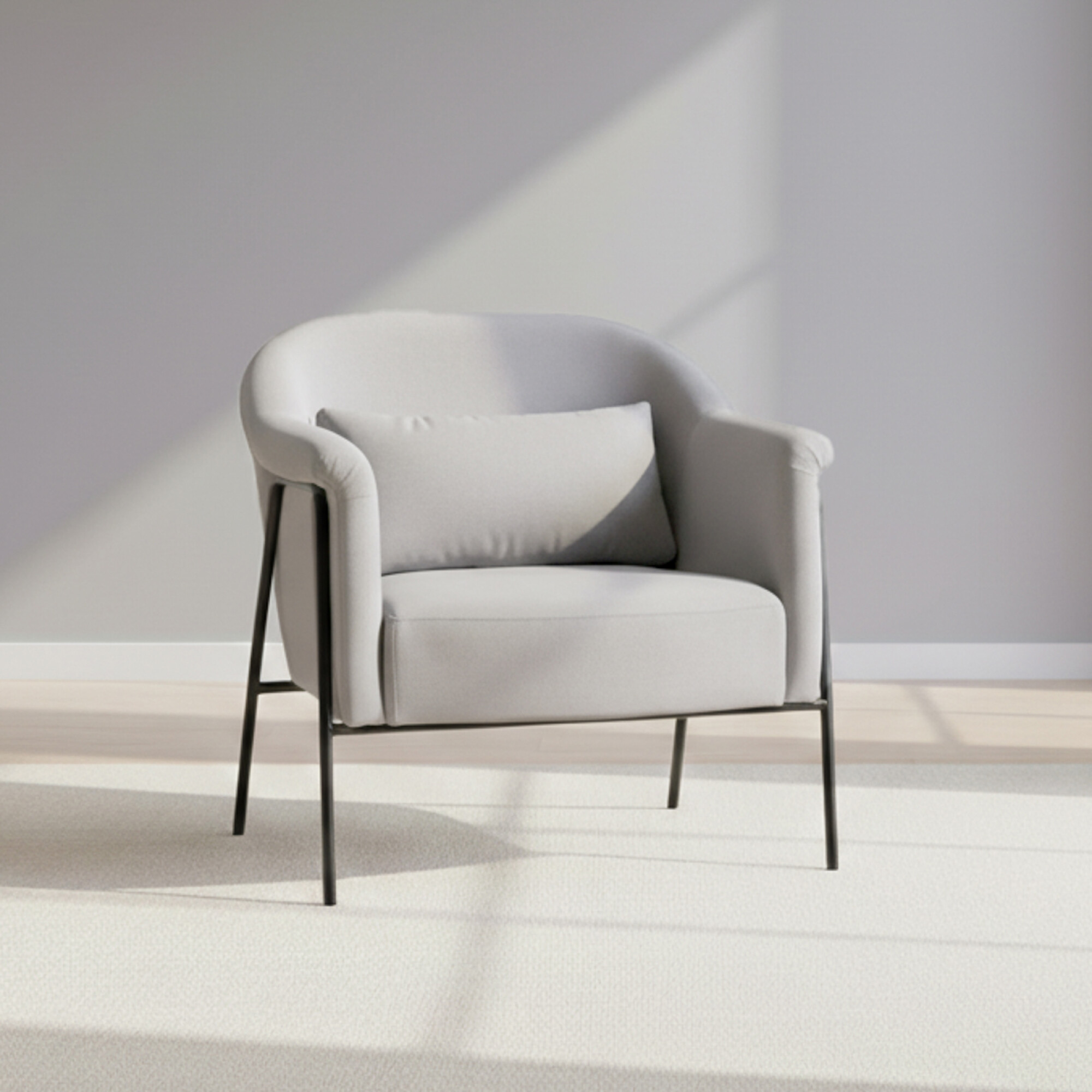 La butaca LYON presenta un diseño contemporáneo con base y patas de acero color negro con pintura epoxi, que aportan firmeza y un acabado moderno. Tapizada en tela de textura suave en tono gris claro, incorpora un almohadón suelto que suma soporte y detalle, reforzando su estética actual y versátil.