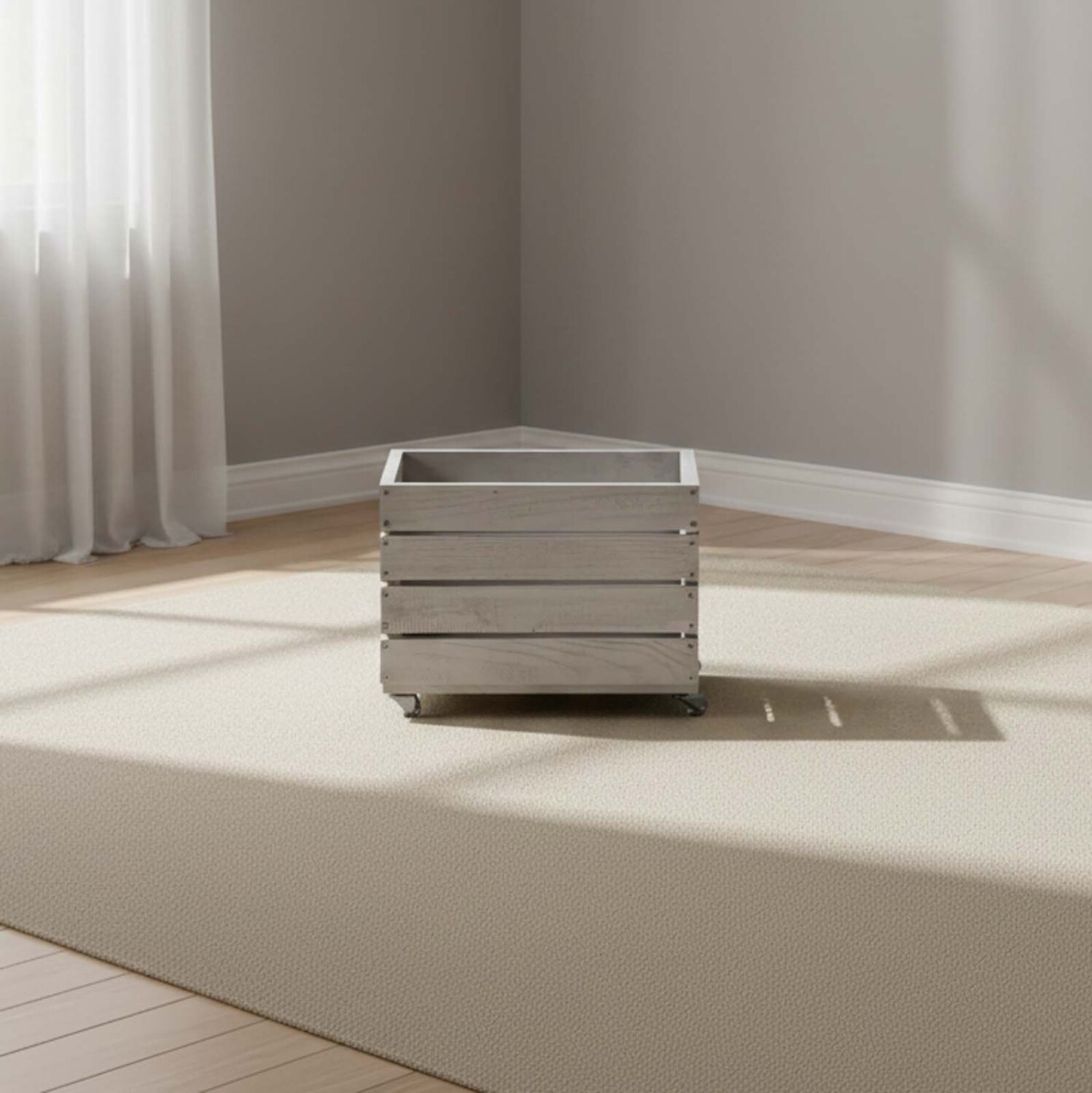 Cajón fabricado en madera de pino y ruedas metalicas. Ideal para organizar juguetes.