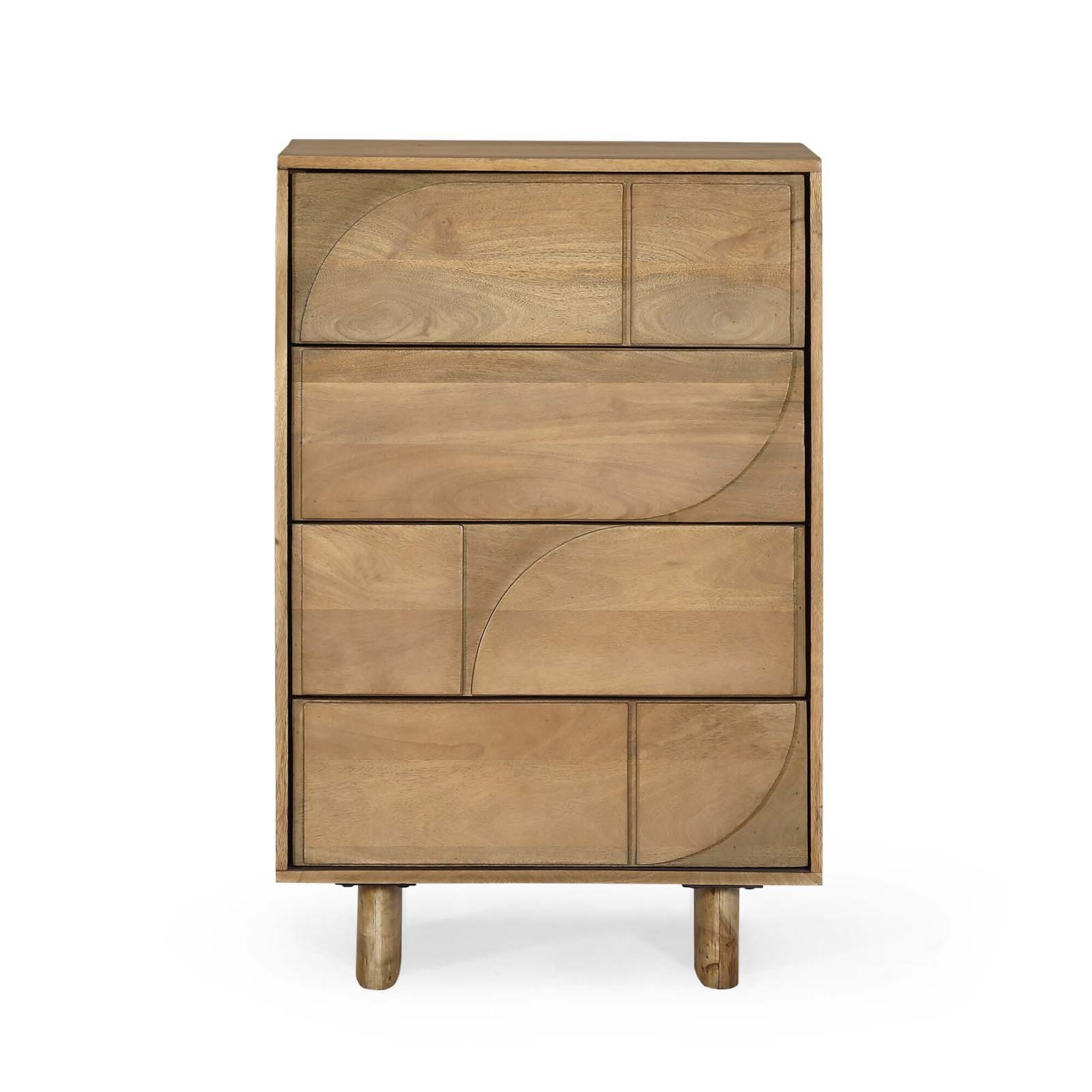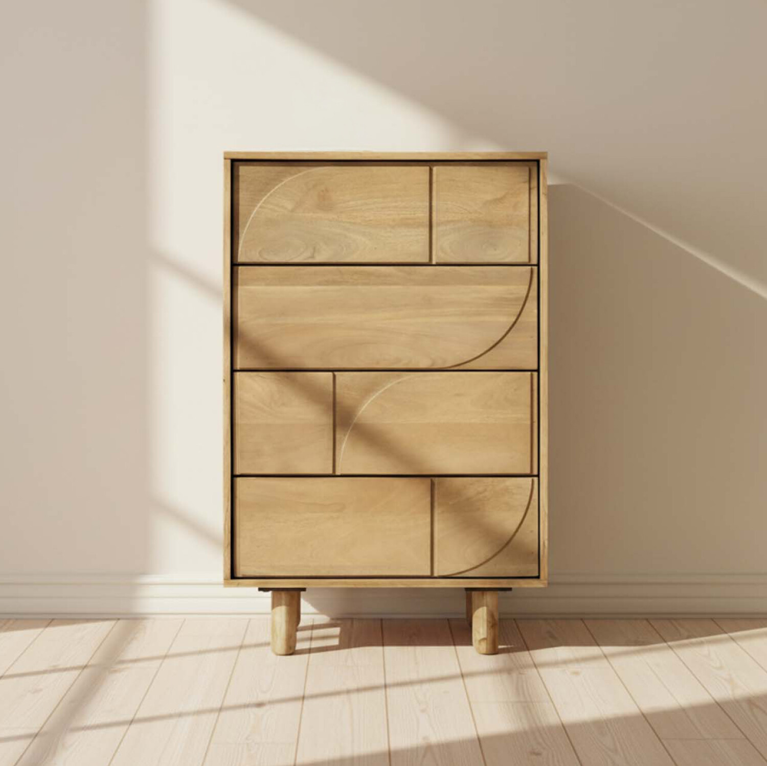 Esta cajonera ÁNGELES de 4 cajones combina funcionalidad y un diseño boho moderno. Su estructura de líneas simples se complementa con frentes de cajón finamente labrados que aportan un detalle distintivo y decorativo. Hecha completamente en madera, es perfecta para dormitorios o espacios de trabajo que buscan orden, calidez y un toque artesanal sutil. Sus cajones cuentan con mecanismo Push to Open, se abren con un toque, permitiendo una apertura sin tiradores, ideal para diseños minimalistas. Viene con tornillos para amurar a pared para una mayor estabilidad y seguridad.