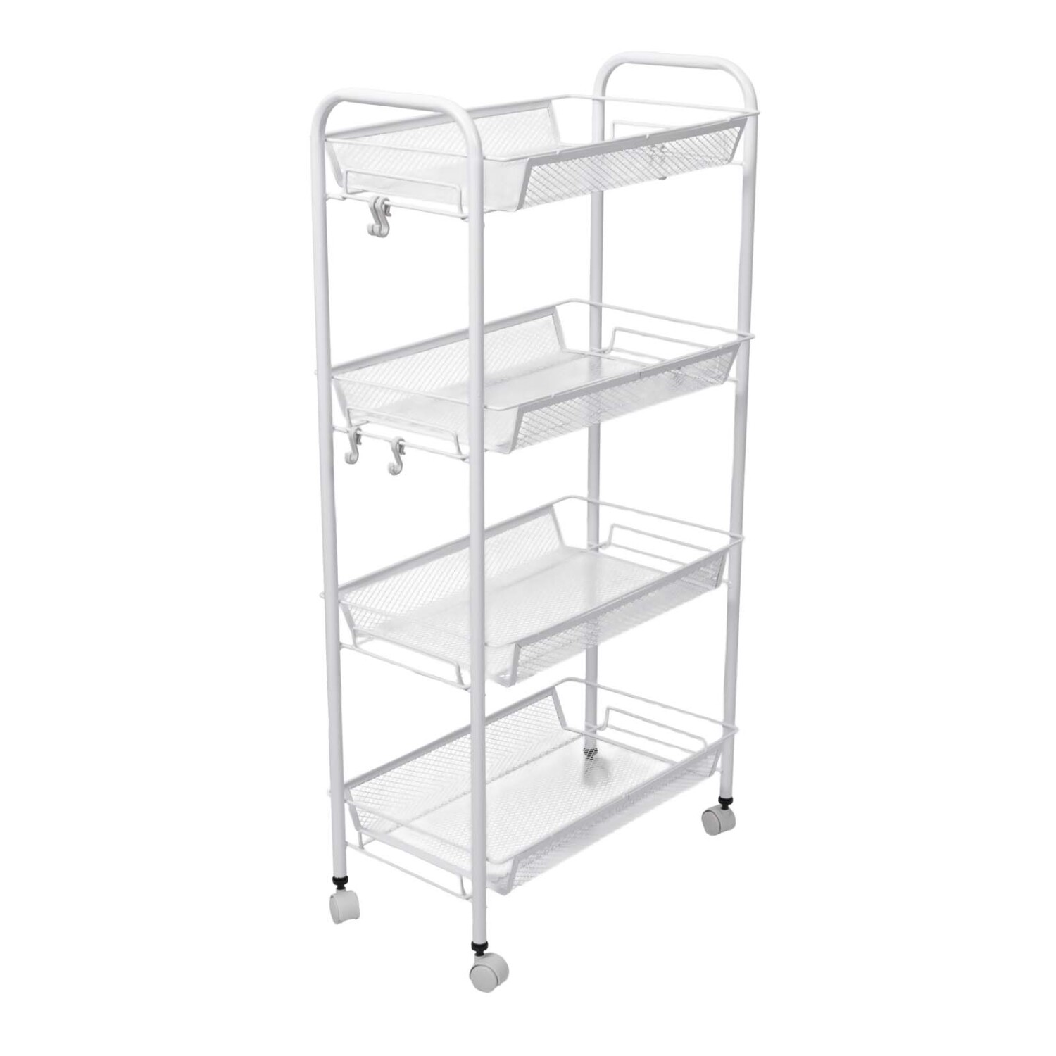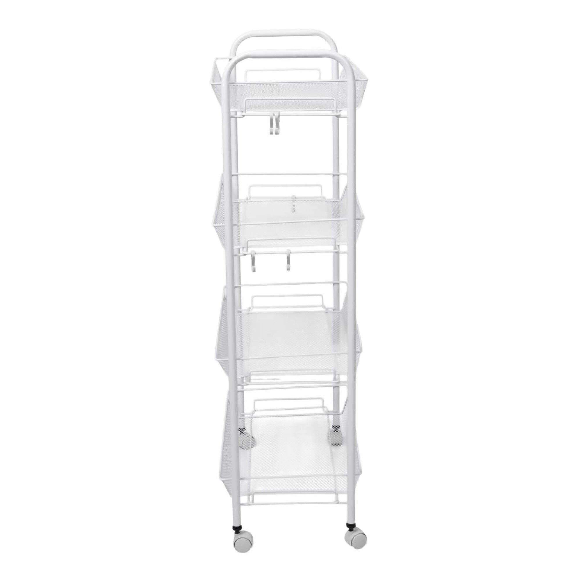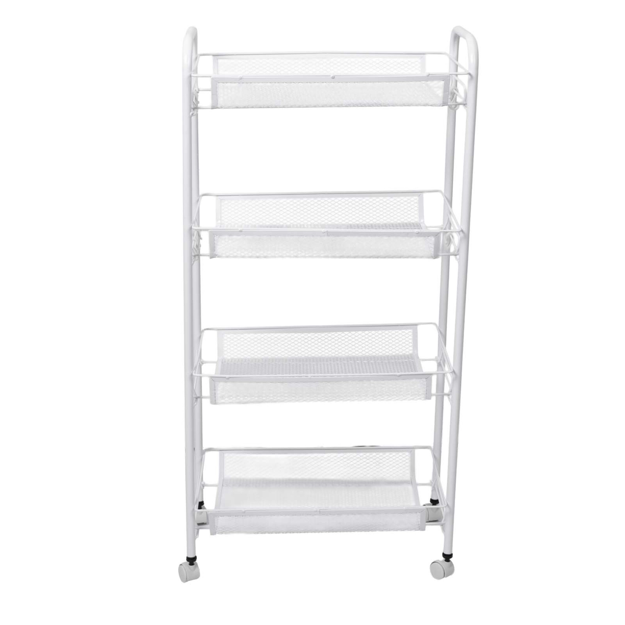 "Carrito organizador de acero blanco, resistente y moderno, ideal para cocina, baño o lavandería. Su diseño con ruedas giratorias permite moverlo fácilmente y sus estantes abiertos facilitan la visualización y acceso a los productos. Disponible en dos tamaños: 27 × 44 × 64 cm o 27 × 44 × 86 cm, perfecto para optimizar espacios y mantener todo ordenado, desde utensilios y especias hasta productos de limpieza o accesorios del hogar."