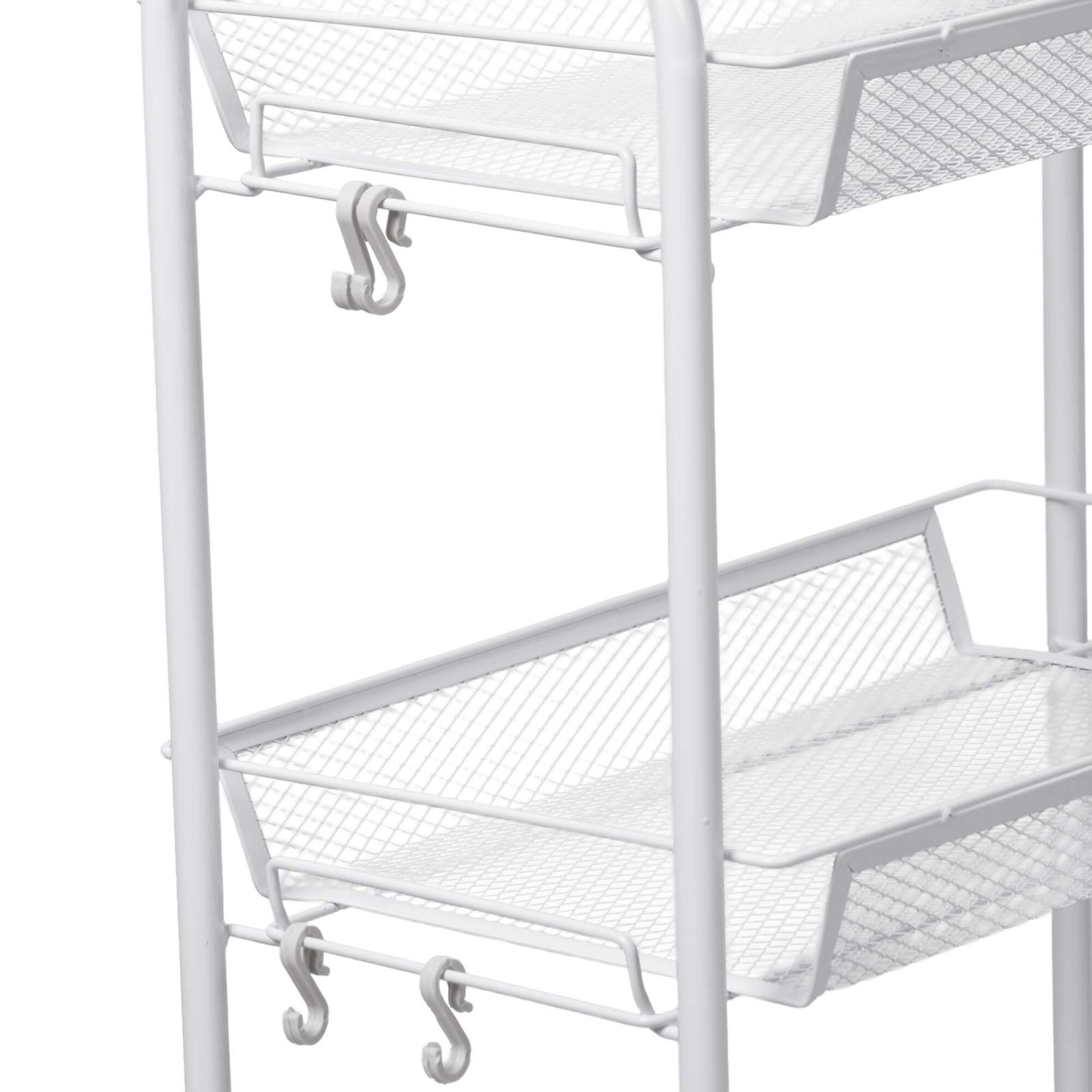 "Carrito organizador de acero blanco, resistente y moderno, ideal para cocina, baño o lavandería. Su diseño con ruedas giratorias permite moverlo fácilmente y sus estantes abiertos facilitan la visualización y acceso a los productos. Disponible en dos tamaños: 27 × 44 × 64 cm o 27 × 44 × 86 cm, perfecto para optimizar espacios y mantener todo ordenado, desde utensilios y especias hasta productos de limpieza o accesorios del hogar."