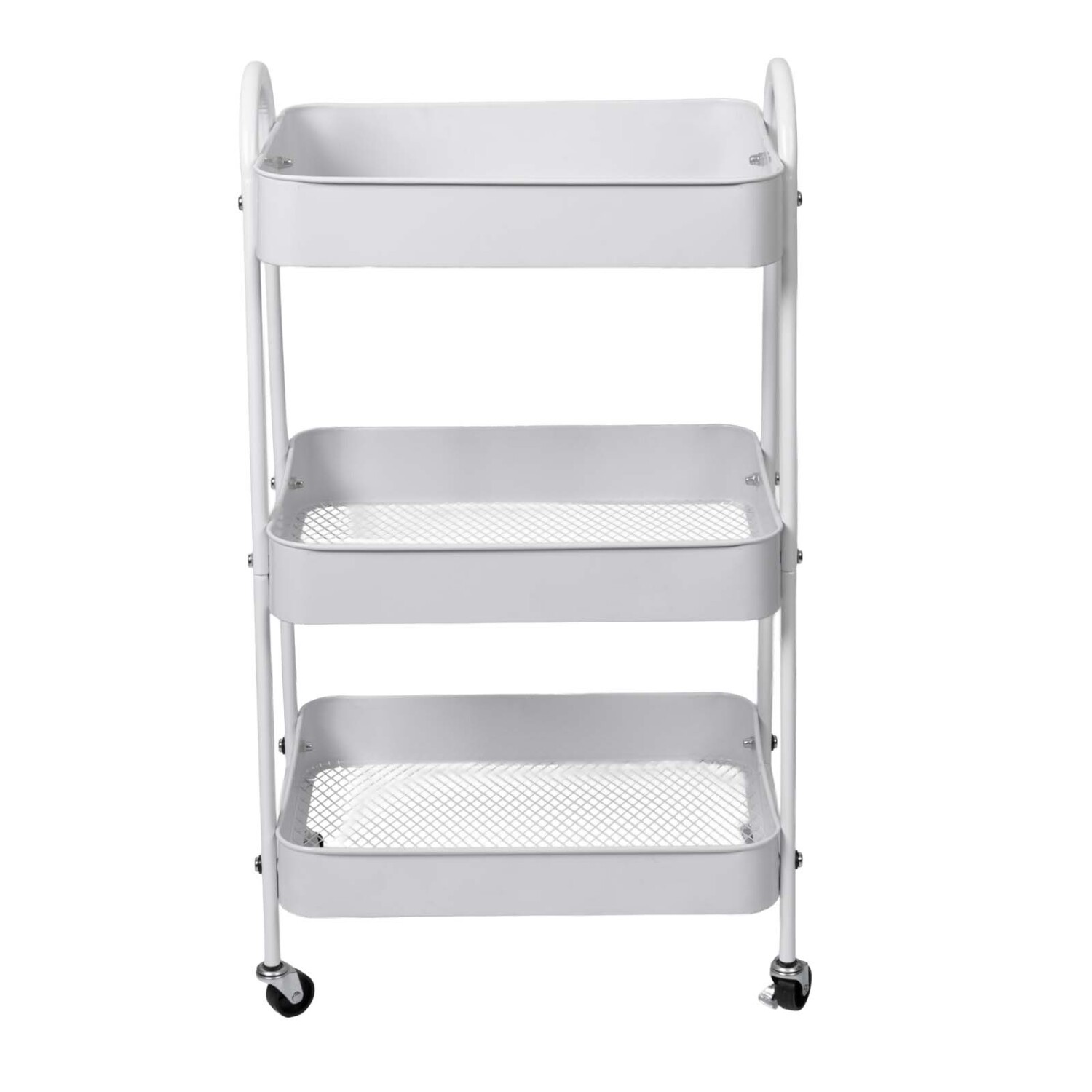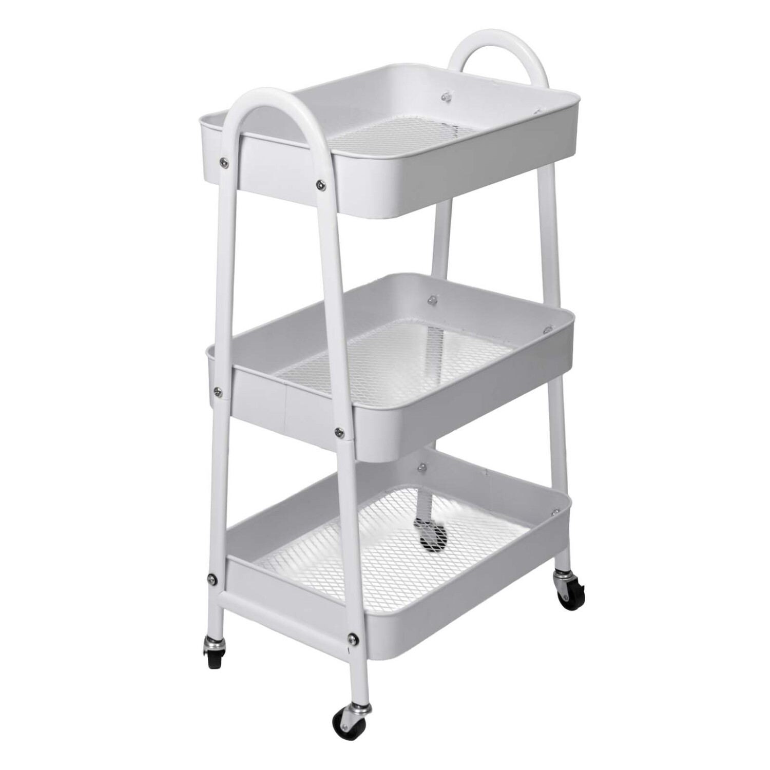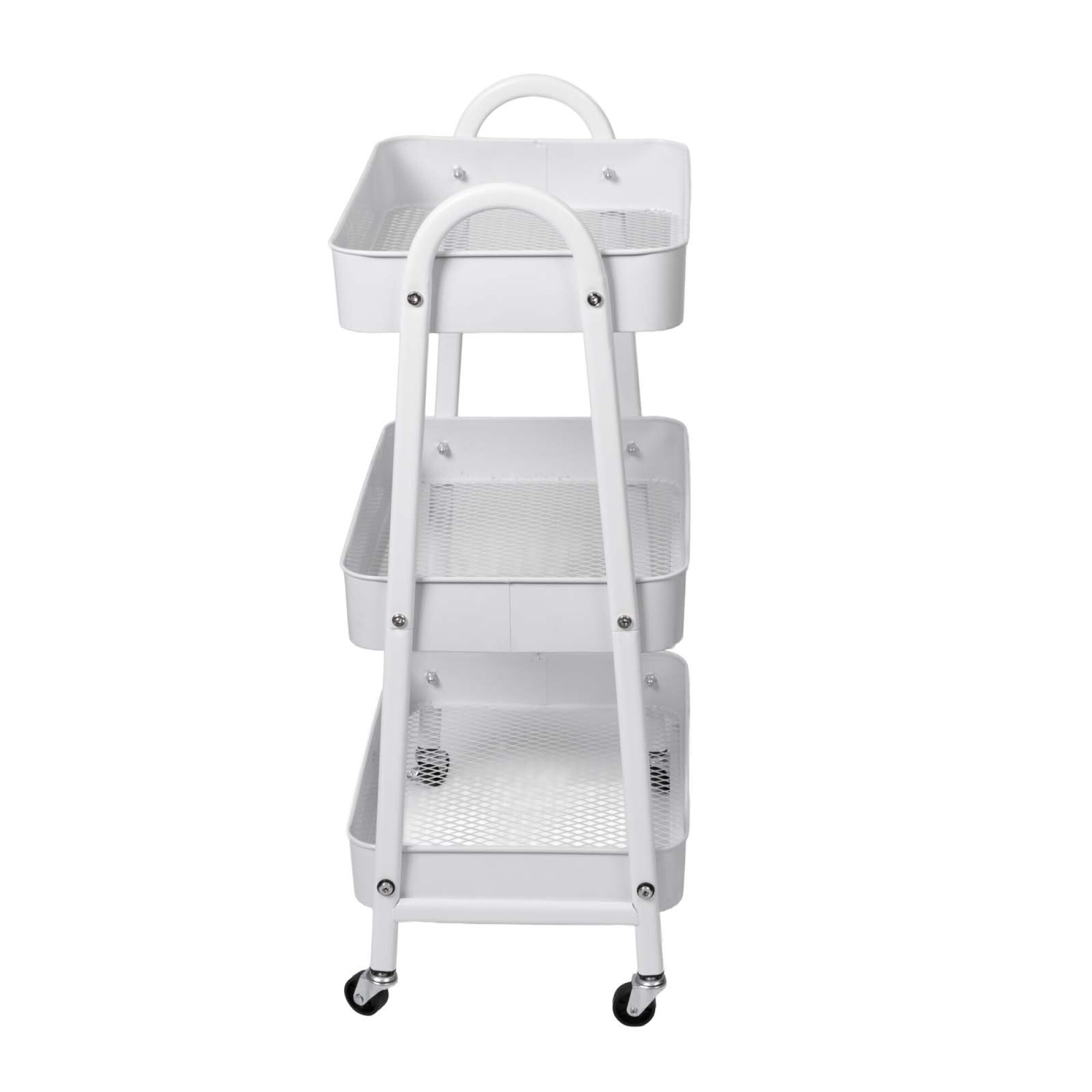 "Carrito organizador de acero blanco, resistente y moderno, ideal para cocina, baño o lavandería. Su diseño con ruedas giratorias permite moverlo fácilmente y sus estantes abiertos facilitan la visualización y acceso a los productos. Medidas: 42x30x77cm de alto."