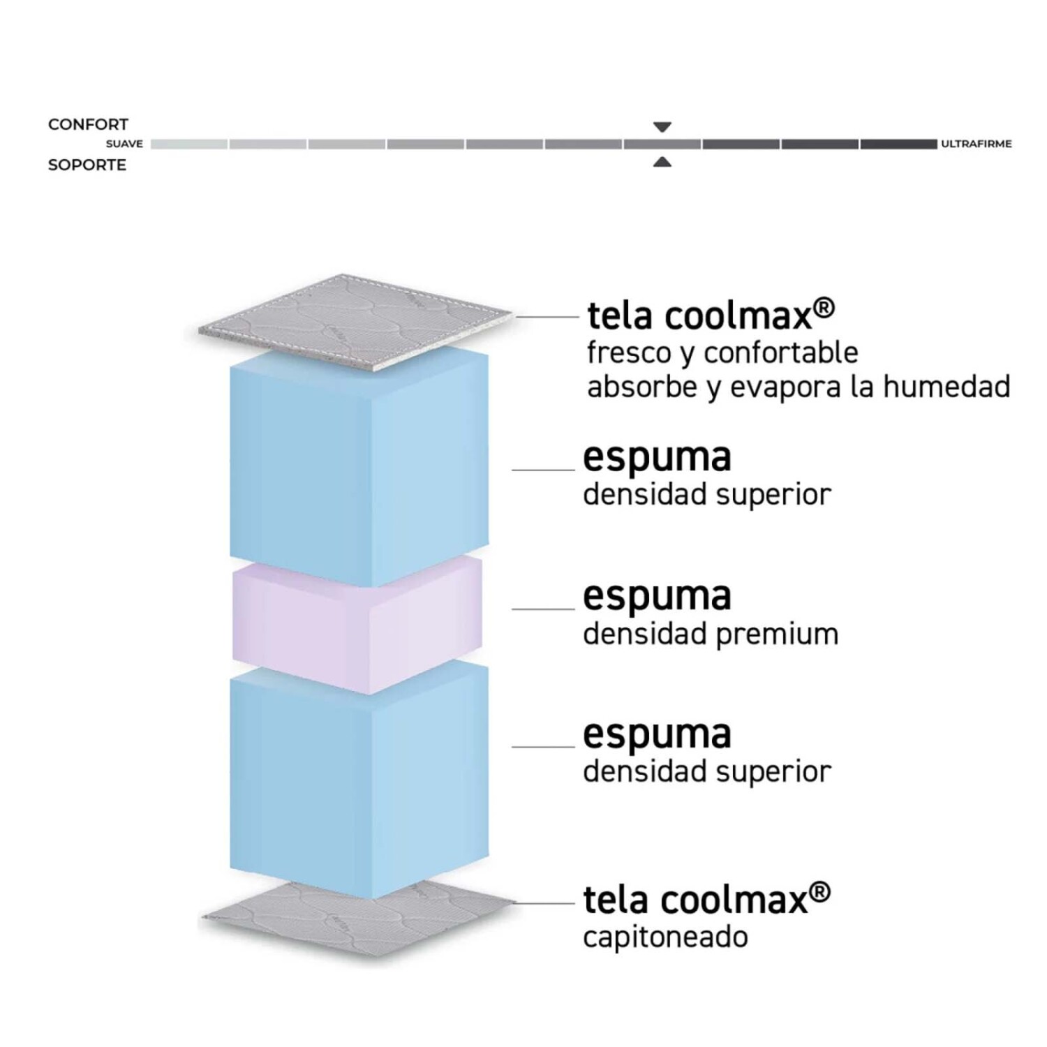 CaracterísticasSu espuma de densidad superior aporta firmeza y garantiza durabilidad al colchón, al tiempo que asegura un excelente nivel de confort. Asimismo, su excelente estructura nos asegura la no transmisión de movimientos, para garantizar un descanso reparador. | ![]() |
