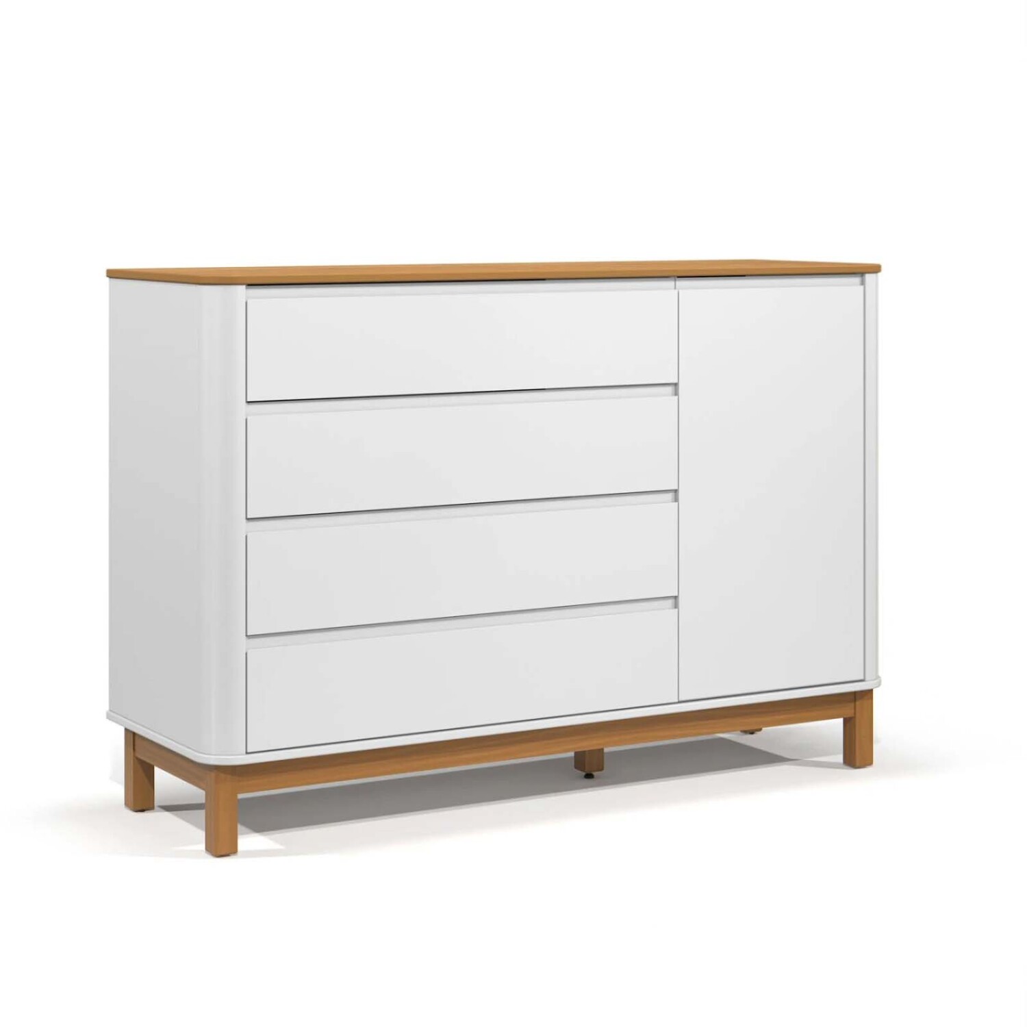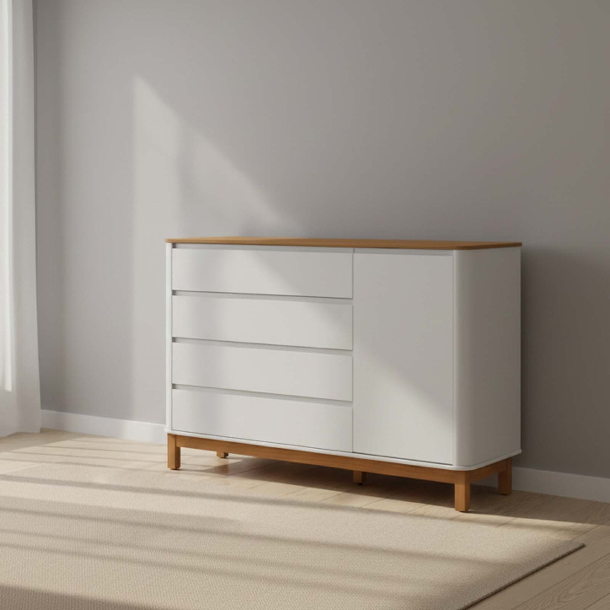 Cómoda fabricada en 100% MDF y base estructural en madera de pino. Cuenta con cuatro cajones con rieles telescópicos y divisores en el cajón superior, además de una puerta con cierre "Slow Motion". Encontra todas las opciones disponibles de la línea FLOW en web y sucursales para complementar con tu cómda. Línea completa para que la habitación quede hermosa y funcional.