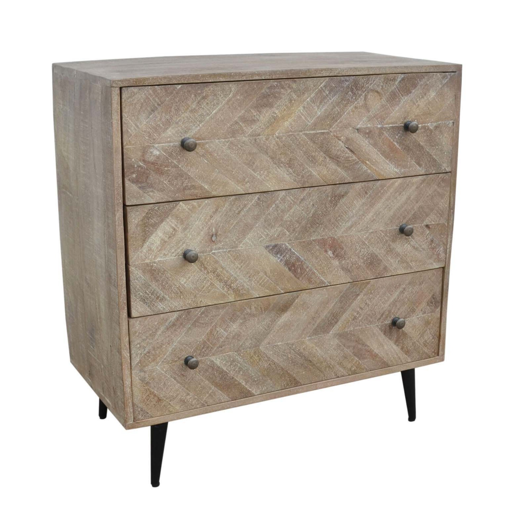 La cómoda ARETINA combina carácter y elegancia en una pieza funcional de fuerte presencia. Fabricada en madera maciza de mango y hierro, ofrece una mezcla equilibrada entre el estilo rústico, industrial y un sutil aire romántico. El acabado en madera natural resalta las vetas propias del material aportando textura y personalidad. Con tres amplios cajones y una capacidad de carga de hasta 20 kg, esta cómoda es ideal para mantener tu espacio ordenado con estilo y calidez.