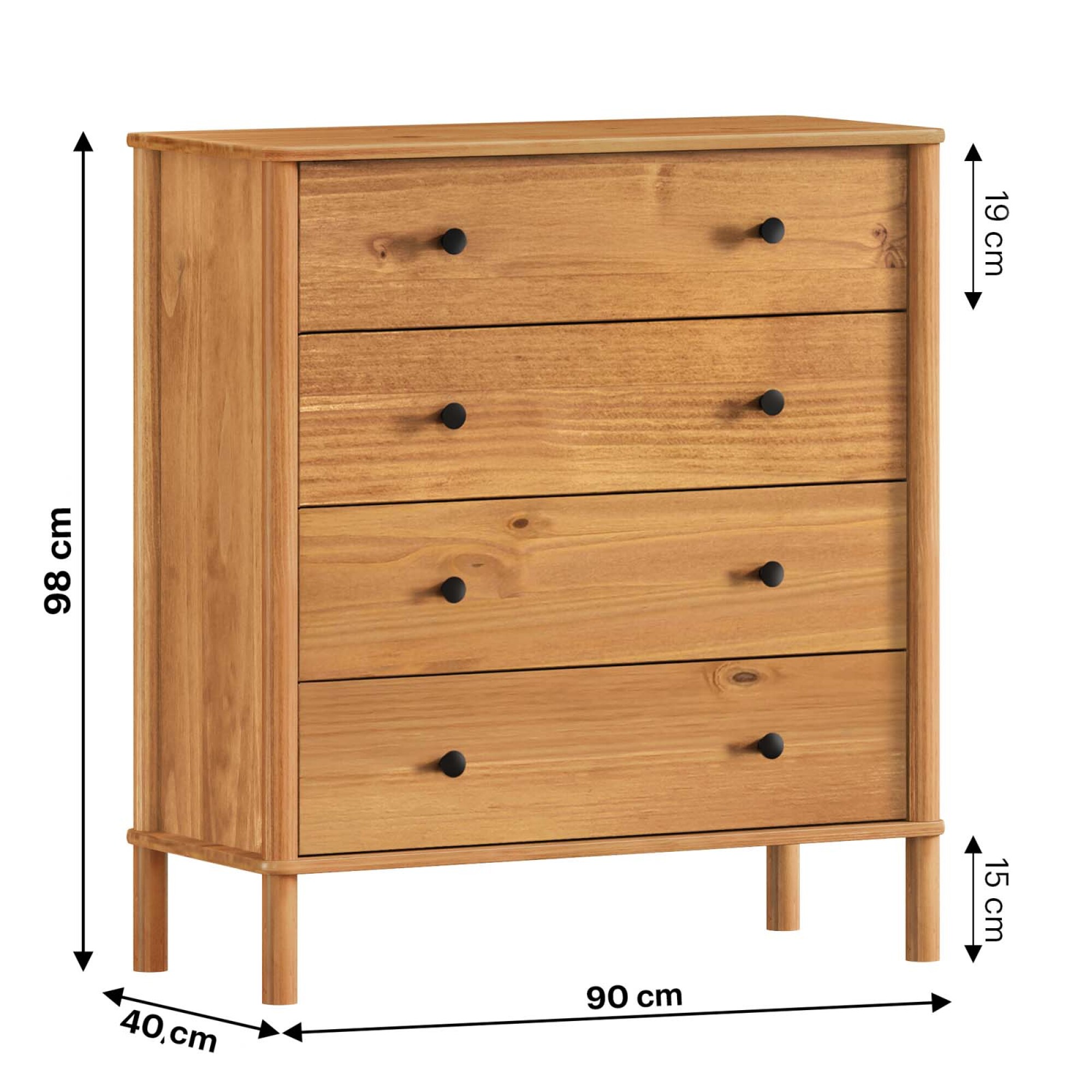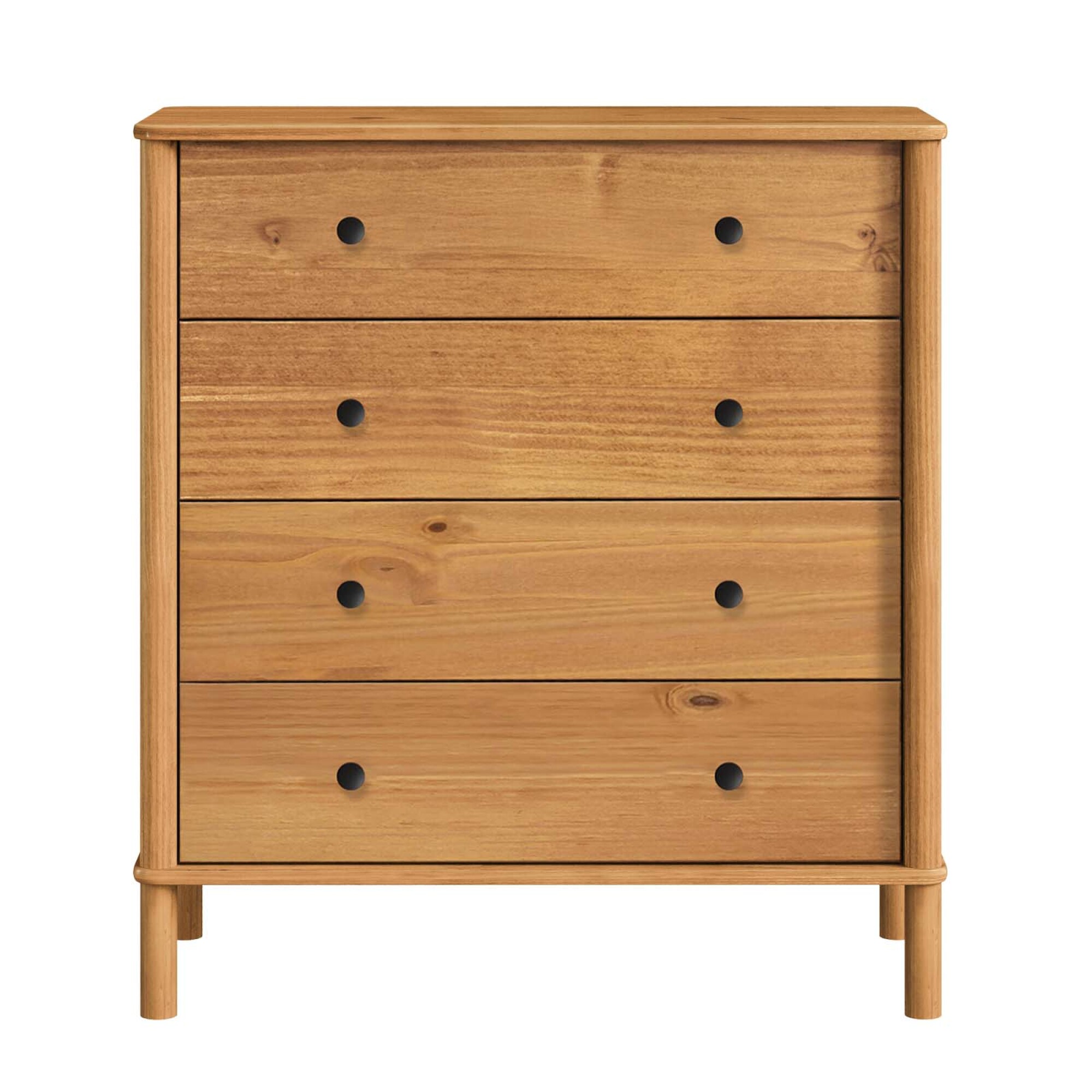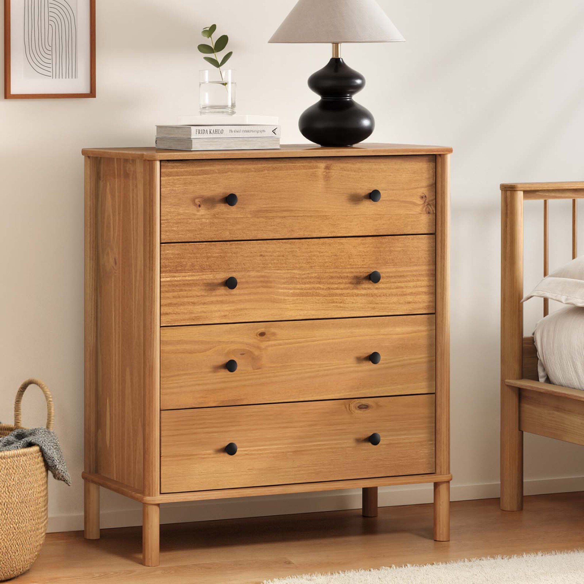 Cómoda de Dormitorio CURAZAO de diseño moderno, fabricada en madera maciza de pino, resistente y duradera. Cuenta con 4 cajones amplios con guías telescópicas, ideales para organizar ropa y objetos personales de forma práctica. Su acabado en tono castaño aporta calidez y combina fácilmente con distintos estilos de decoración. Las laterales redondeadas refuerzan su estética contemporánea y elegante. Medidas (lxpxa): 90x40x98cm