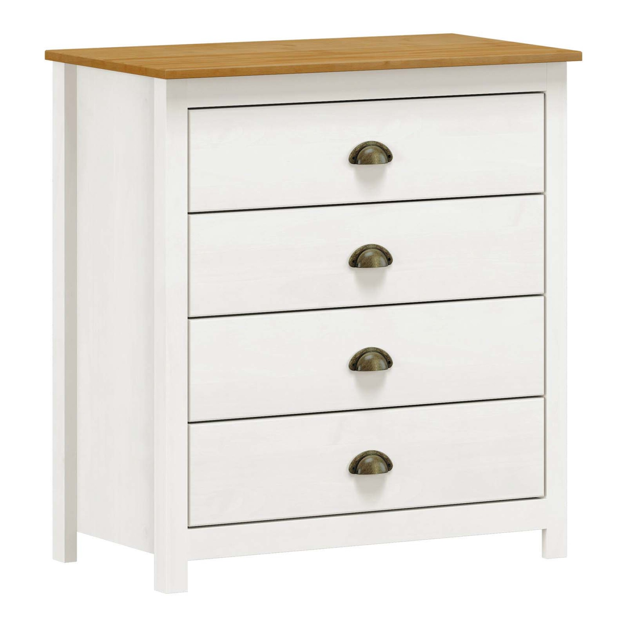 La cómoda cajonera de 4 cajones pino Topazio es una solución práctica y funcional para tu dormitorio, con estilo rústico y un diseño que combina blanco y madera para aportar luminosidad y calidez. Fabricada en madera maciza de pino, mide 80 cm de largo, 84,5 cm de alto y 40,5 cm de ancho, ofreciendo cuatro cajones amplios con rieles telescópicos que facilitan una apertura suave y cómoda. Sus tiradores metálicos color bronce aportan un detalle distintivo que realza su presencia y armoniza con otras cómodas o muebles de la línea Topazio, creando un ambiente ordenado, coherente y atractivo que invita a incorporarla a tu hogar.