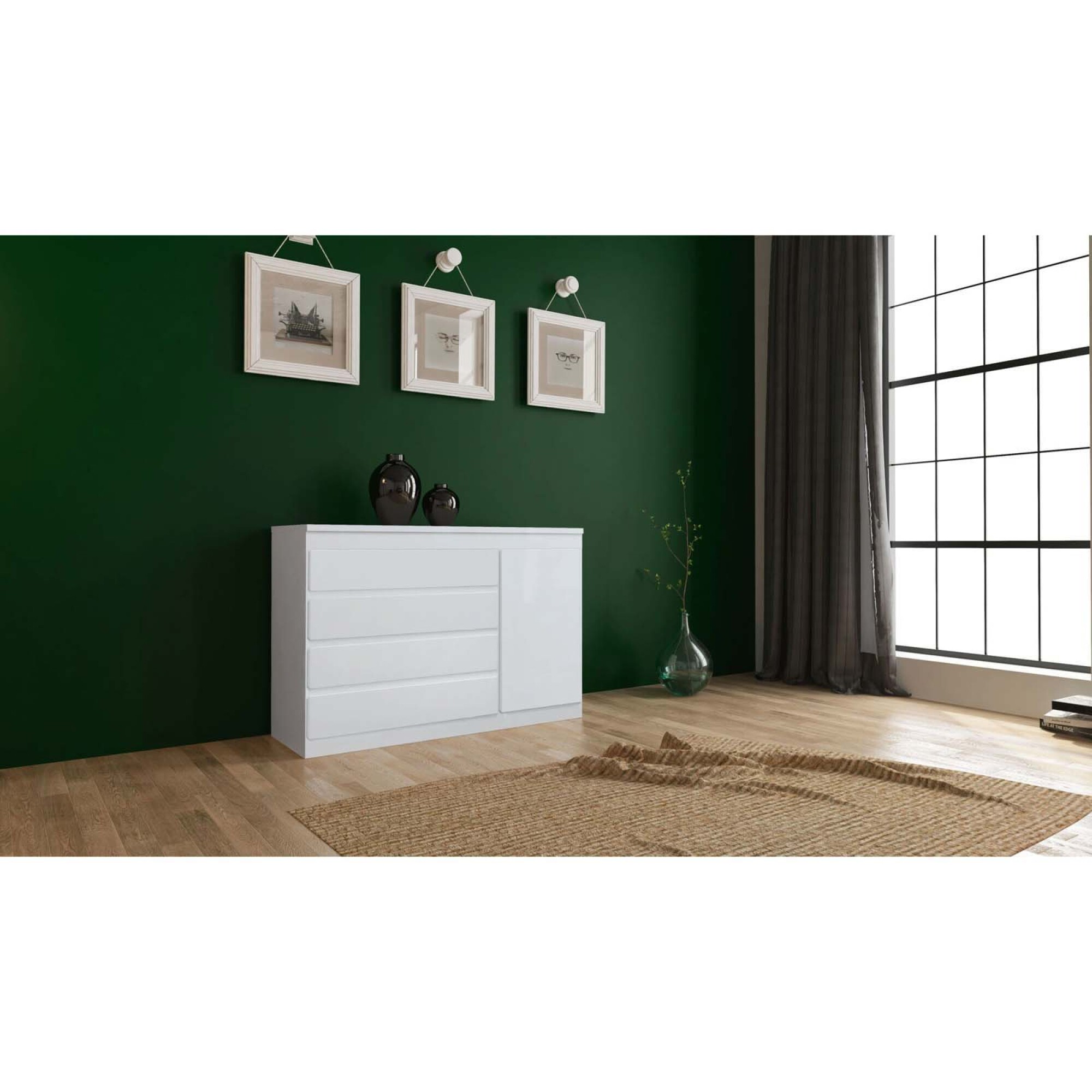 La cómoda cajonera y zapatera 1 puerta de MDF blanco South ofrece un diseño funcional y estilo urbano, ideal para optimizar espacios modernos. Con medidas de 135 cm de largo, 90 cm de alto y 46,5 cm de ancho, aprovecha al máximo cada centímetro gracias a sus 4 amplios cajones y a un práctico compartimento lateral con estante y puerta. Fabricada completamente en MDF, garantiza estructura firme, terminaciones prolijas y excelente resistencia. Sus corredizas telescópicas permiten un deslizamiento suave y silencioso, aportando comodidad en el uso diario. En color blanco, se integra con facilidad a diferentes ambientes y puede combinarse con el resto de la línea South para lograr un dormitorio armonioso, organizado y listo para disfrutar, haciendo de esta cómoda una elección segura y conveniente.