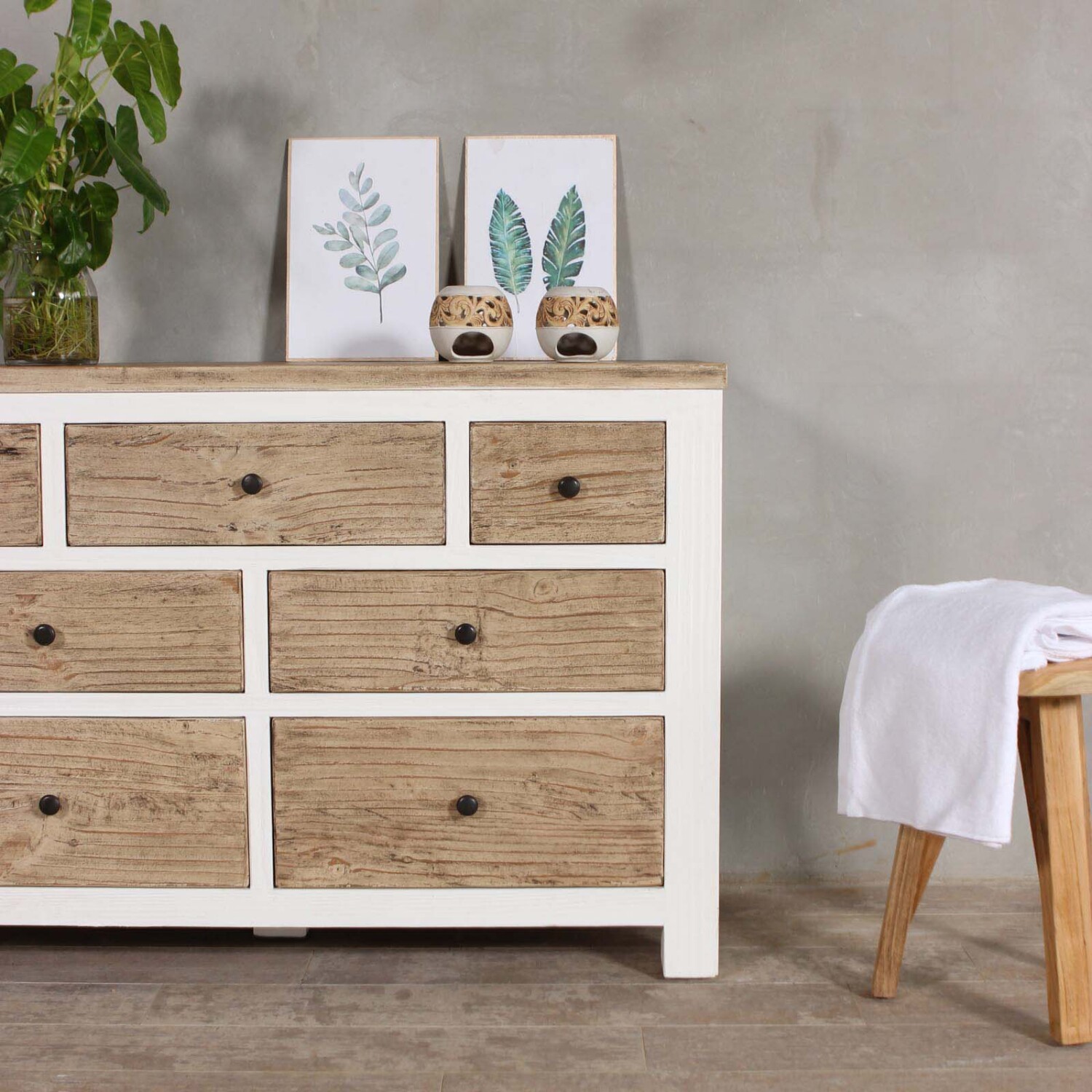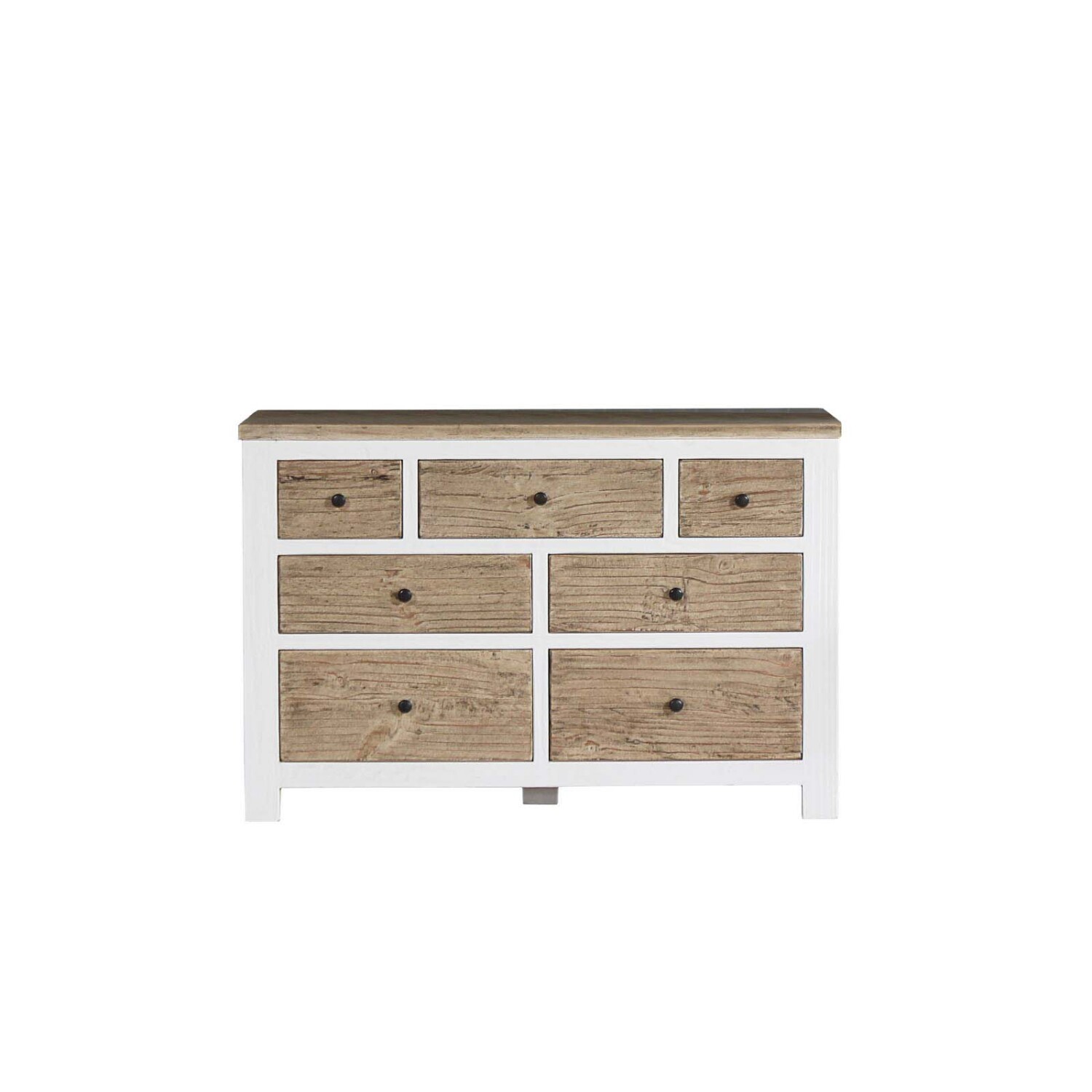 La Cómoda AREZZO fabricada en madera Teca reciclada, cuenta con 7 cajones amplios que brindan un buen espacio de almacenamiento para guardar los objetos personales y mantener el dormitorio ordenado y organizado. La combinación de colores blanco y madera le brinda un toque rústico y sofisticado al mismo tiempo y se adapta a distintos estilos de decoración. La madera Teca Reciclada no solo es una opción sostenible sino que también le aporta una belleza natural y durabilidad. Una opción ideal para quienes buscan aportarle personalidad a su dormitorios. Conozca también la Mesa de Luz Arezzo.
