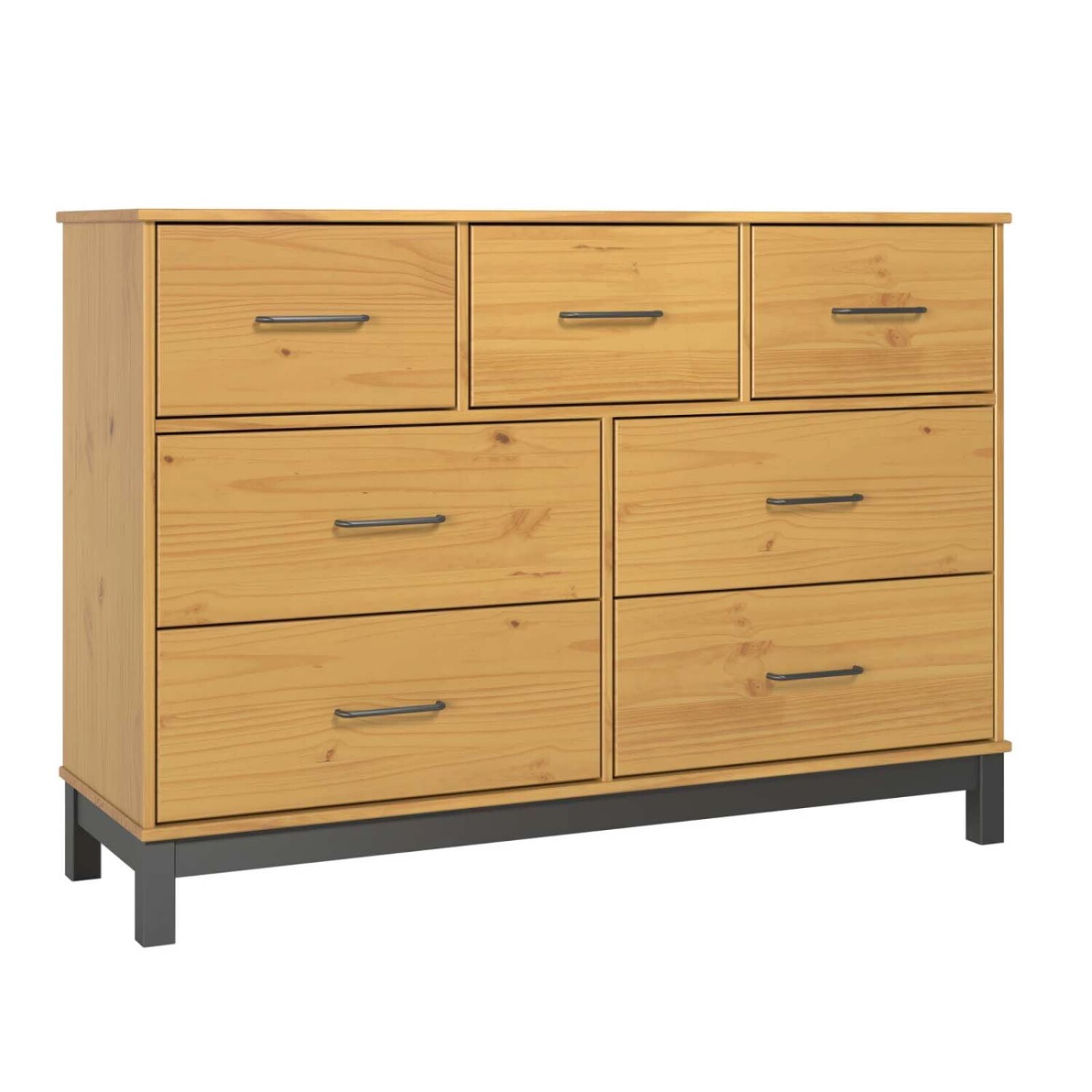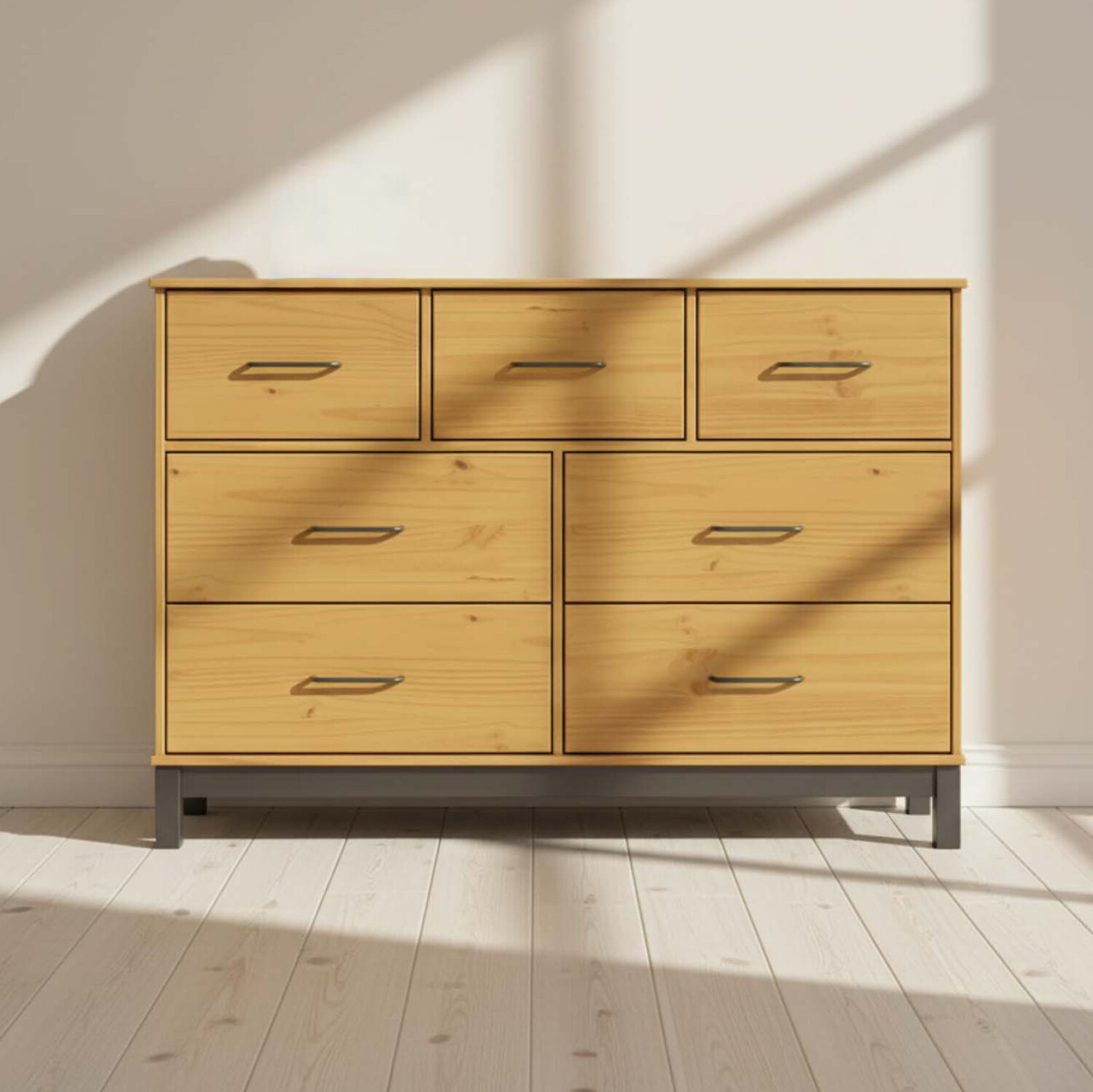 Amplia y versátil, esta cómoda de siete cajones es ideal para quienes necesitan espacio de guardado sin comprometer el diseño. Confeccionada en madera maciza de pino y protegida con barniz PU y UV, incorpora detalles metálicos y correderas suaves que realzan su carácter industrial y clásico.
