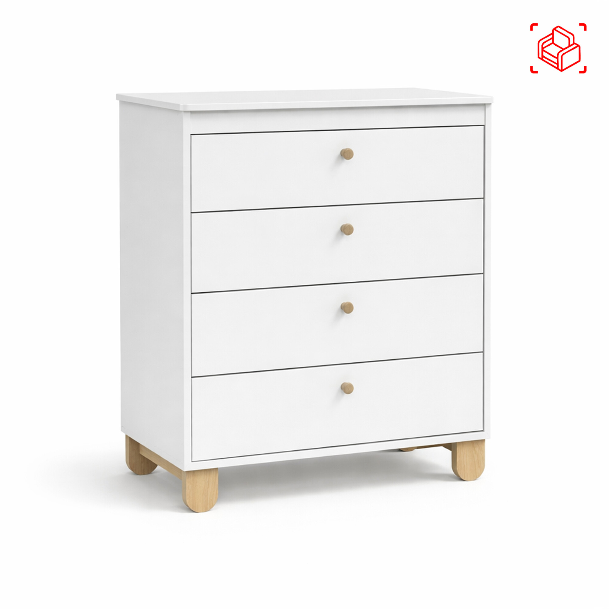 Comoda en MDF y patas de madera de pino. 4 cajones.