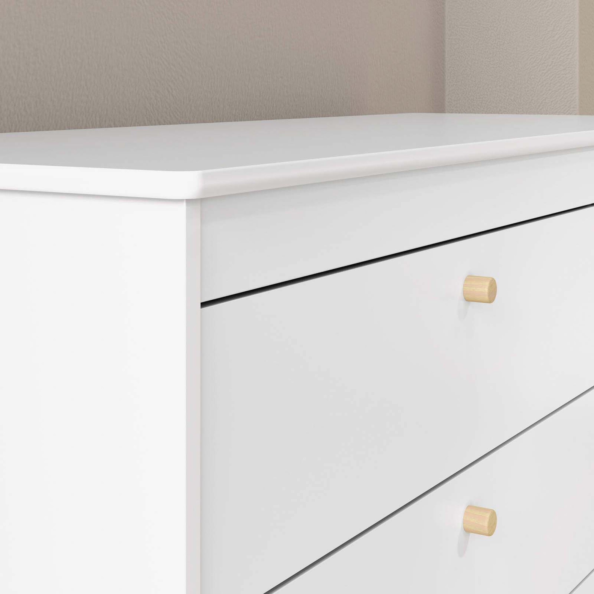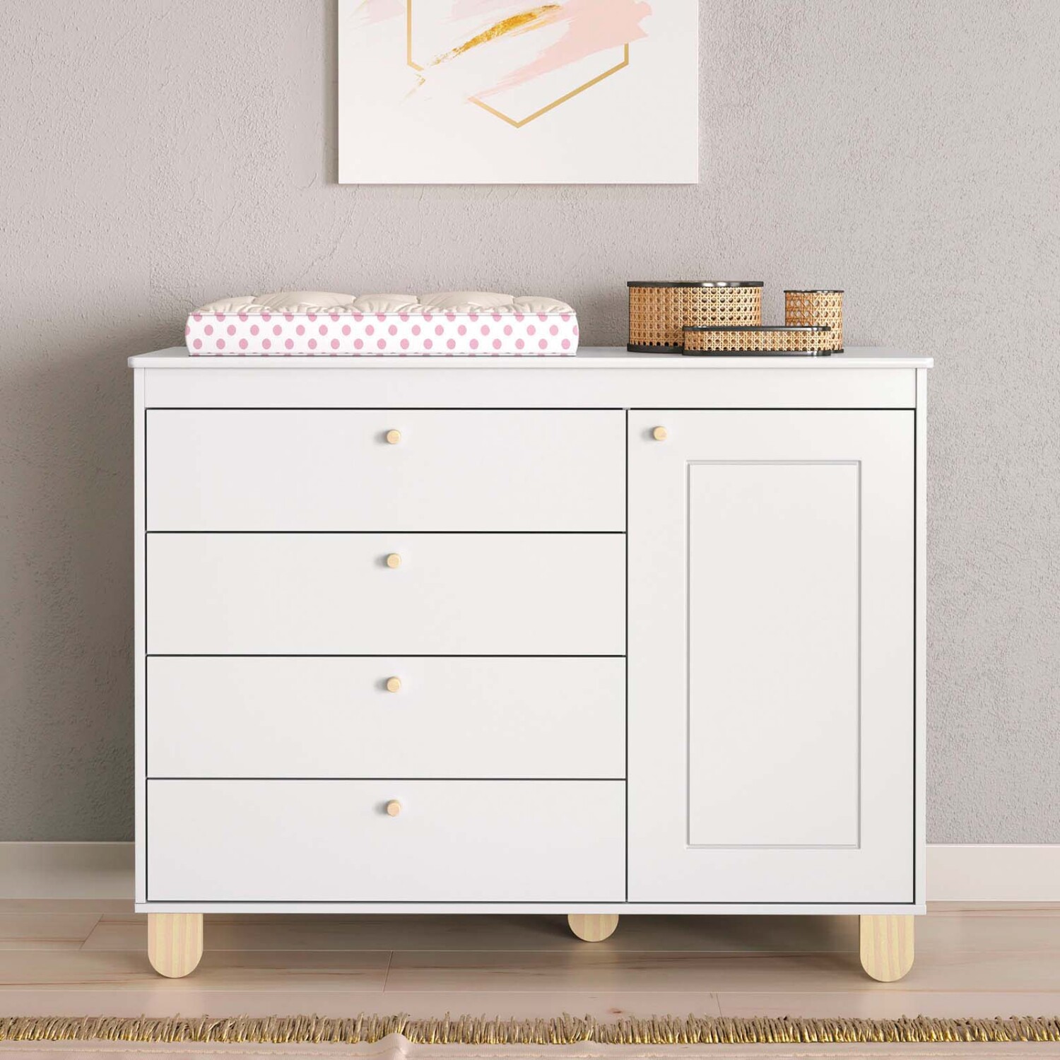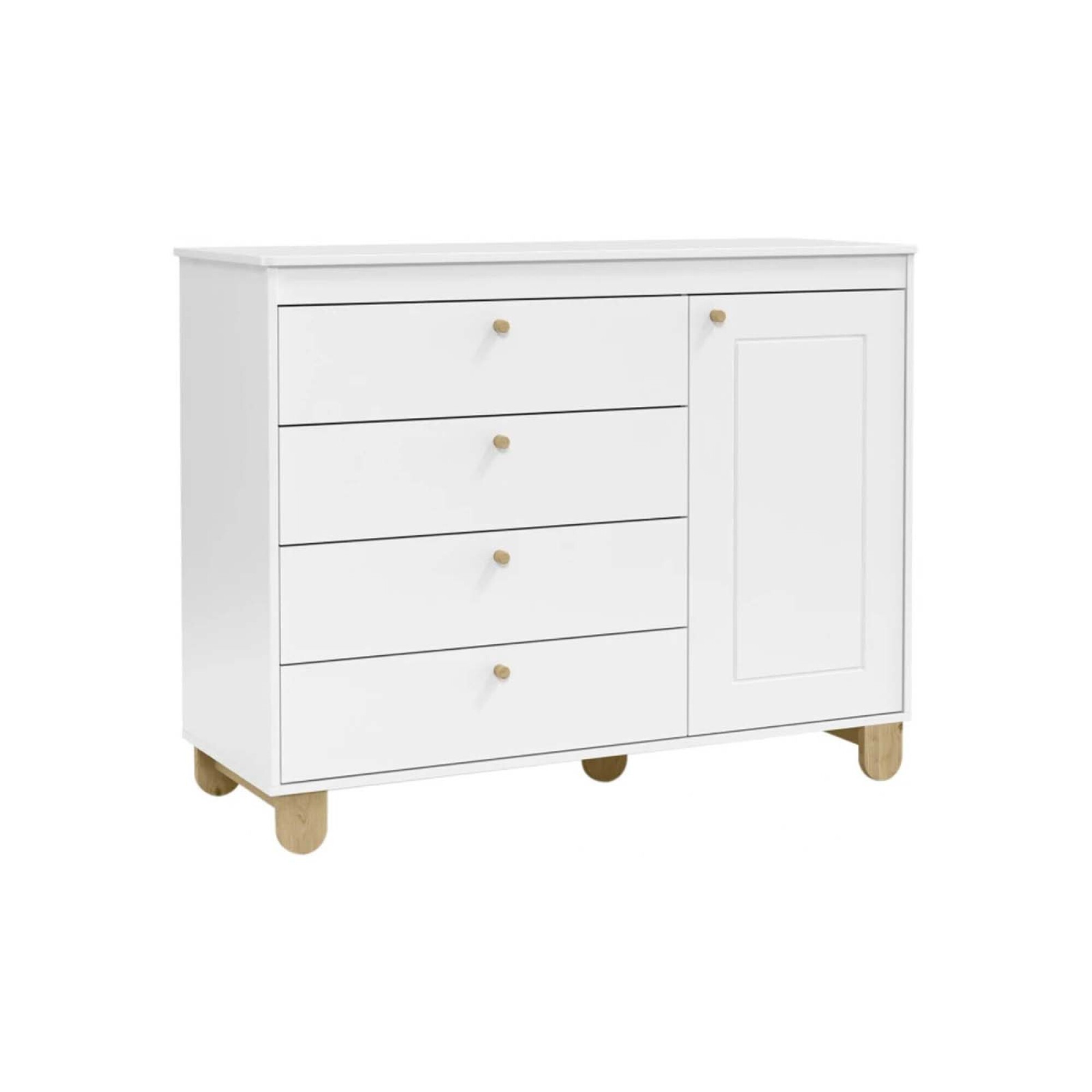 Comoda en MDF y patas de madera de pino. 4 cajones y 1 puerta.