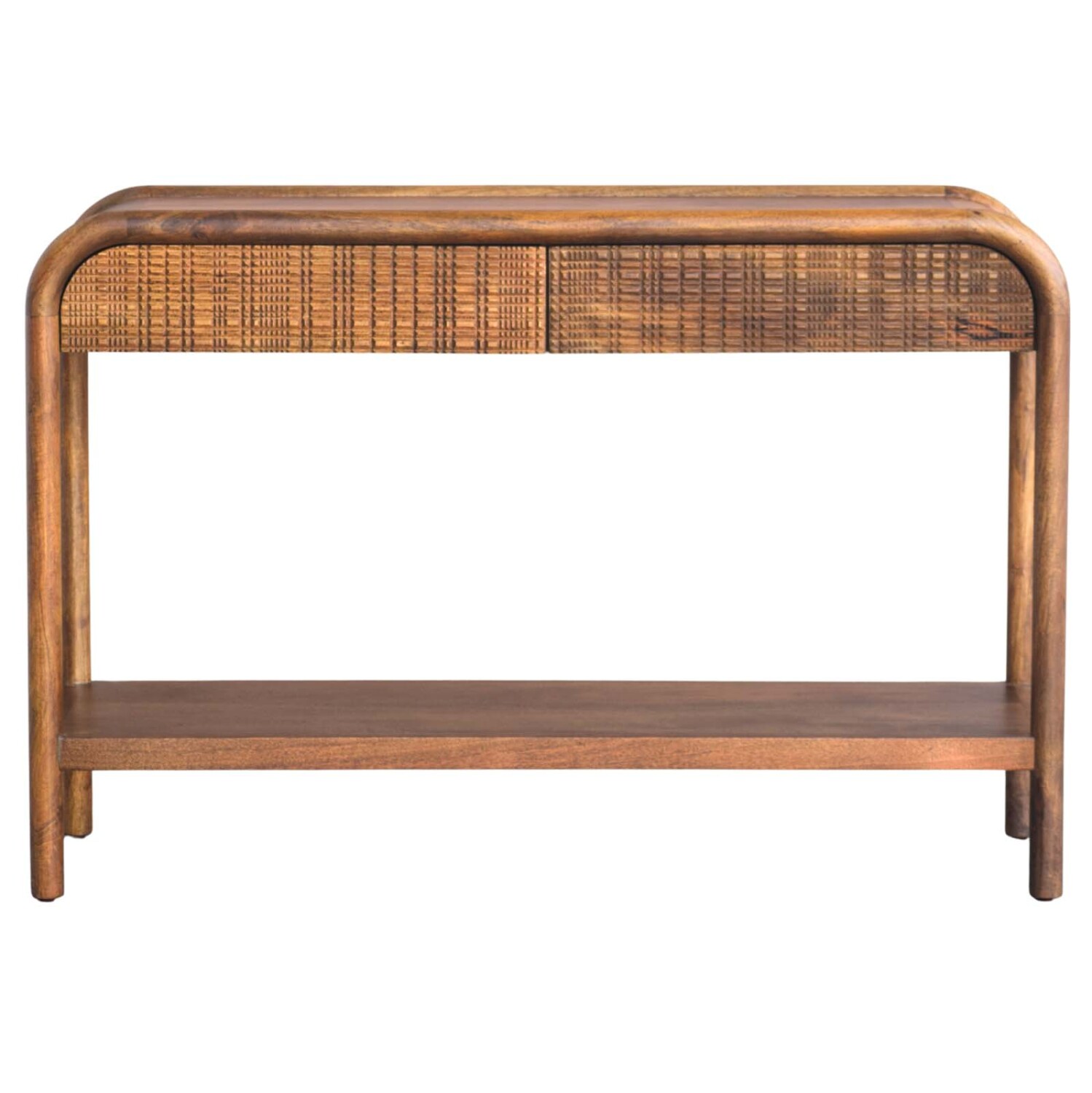 "Consola, mueble de arrime de diseño rústico e inspiración vintage, fabricado en madera de mango con bonito acabado en color natural y frente con decoraciones traceadas. Su fabricación es artesanal, por lo que entendemos las variaciones de tonalidad o ciertas imperfecciones (grietas, nudos o marcas) como un valor añadido que lo convierten en una pieza única. "