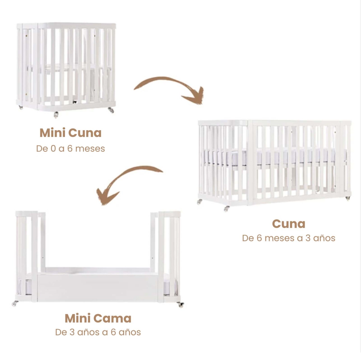 Fabricada en madera maciza de pino, esta cuna evolutiva cuenta con un sistema de conversión que permite transformarla de mini cuna a cuna y de cuna a mini cama. Incorpora ruedas de silicona con freno que facilitan el traslado sin dañar el piso y de forma segura. Medidas: mini cuna 75,7 cm x 62,3 cm x 79,0 cm; cuna 136,0 cm x 75,7 cm x 79,0 cm; mini cama 136,0 cm x 75,7 cm x 73,7 cm. Peso máximo soportado: 100 kg distribuidos.