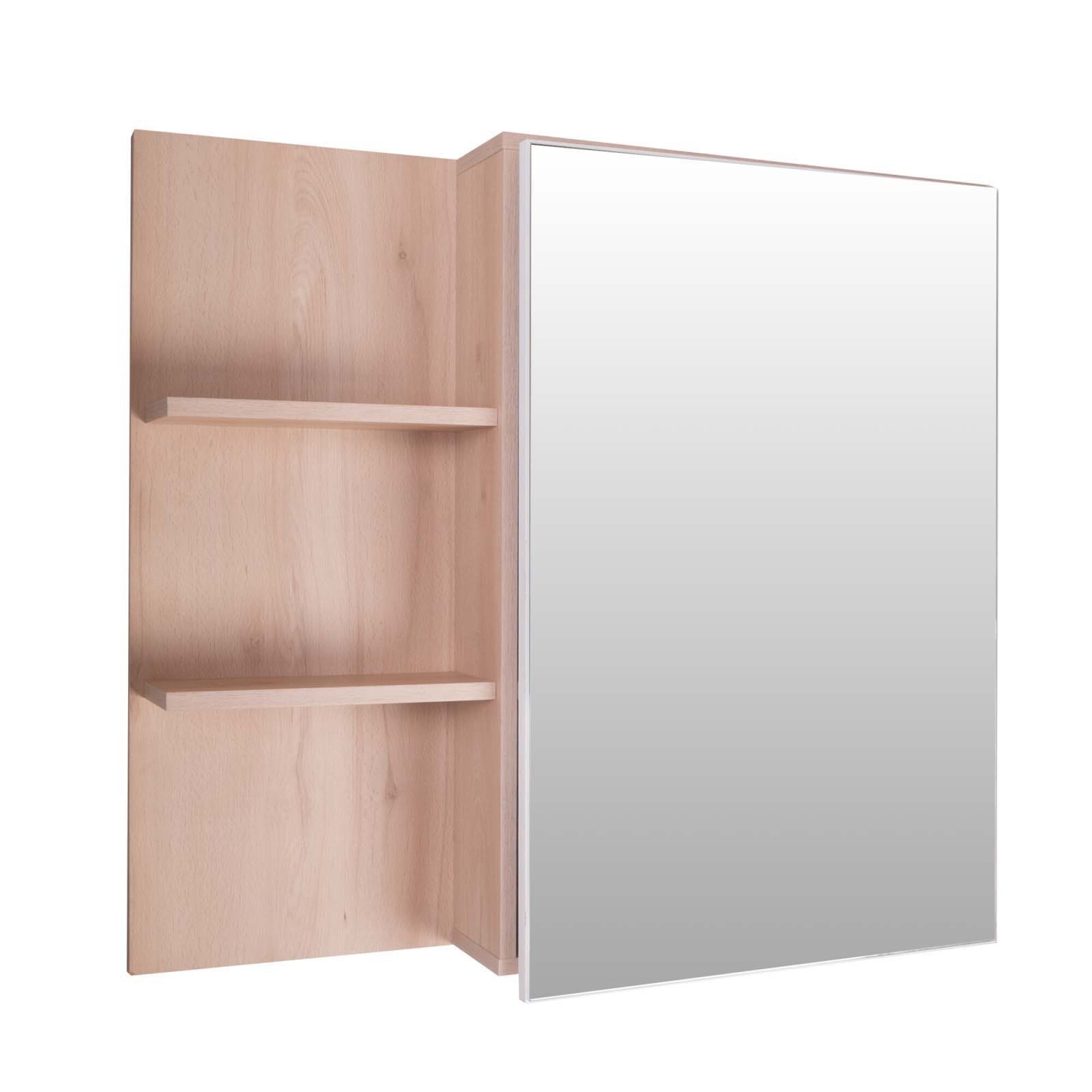 Espejo de baño con estructura en MDF, con puerta y espacio de guardado tipo botiquín más estantes.