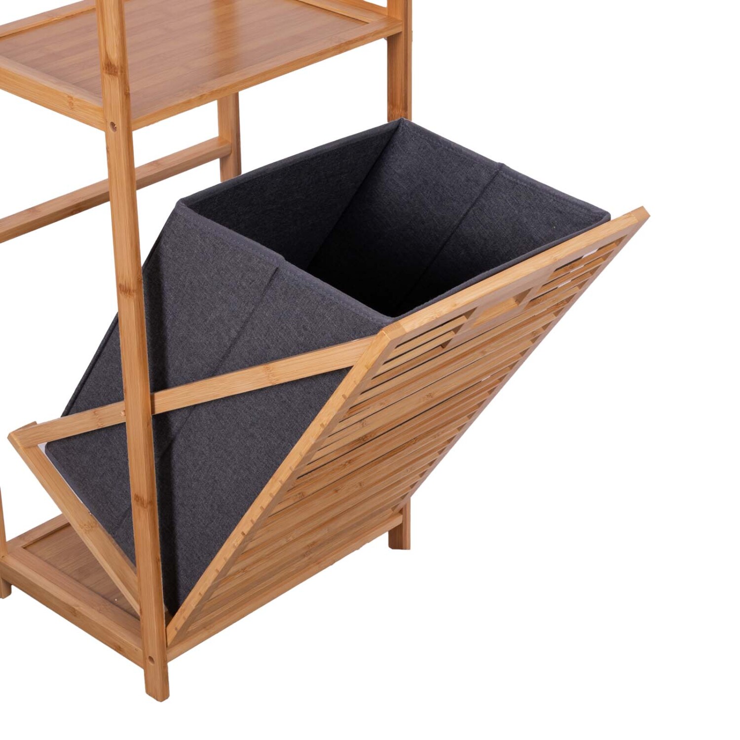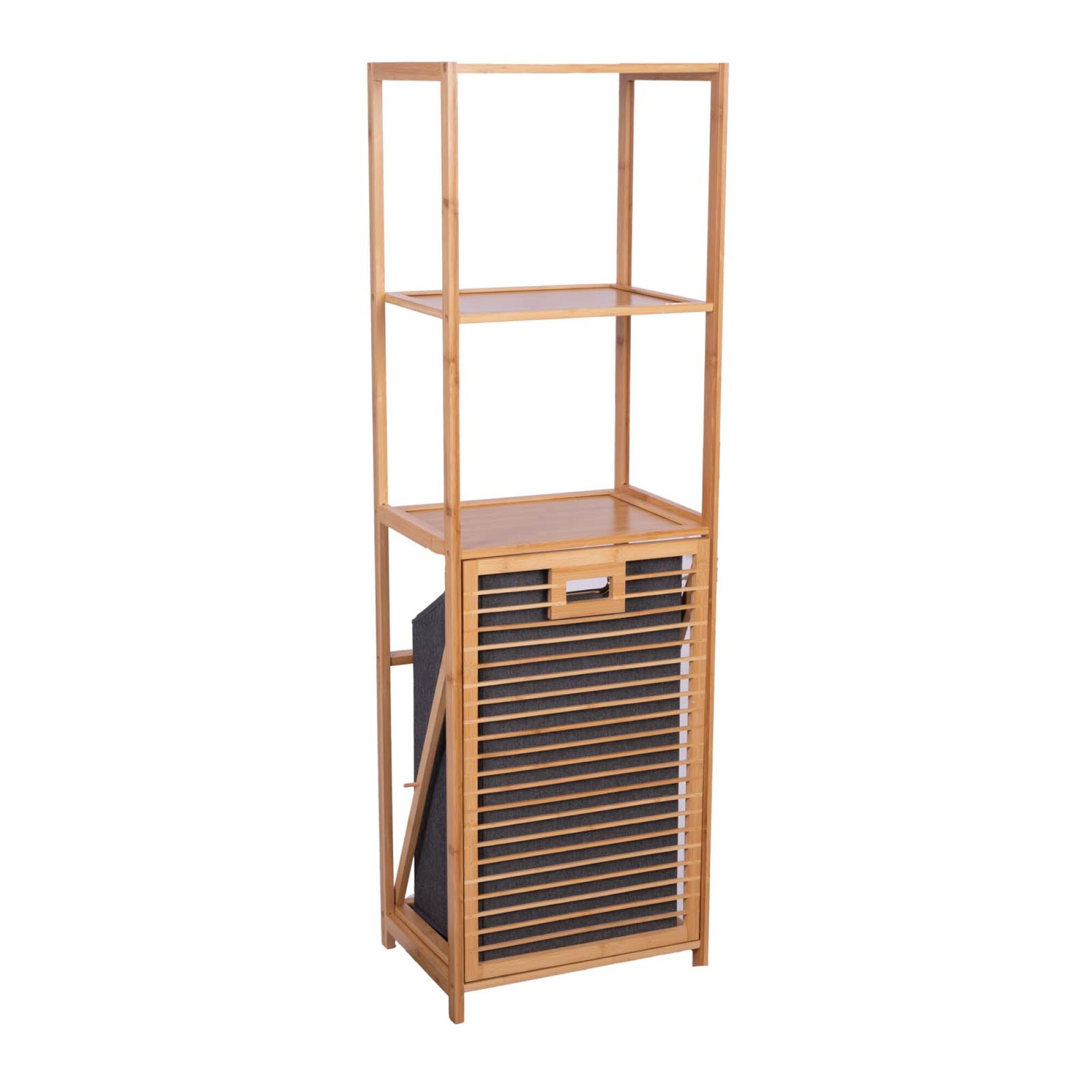 Mueble multiuso de baño/lavandería en madera de bambú, con estantes y cesto para ropa.