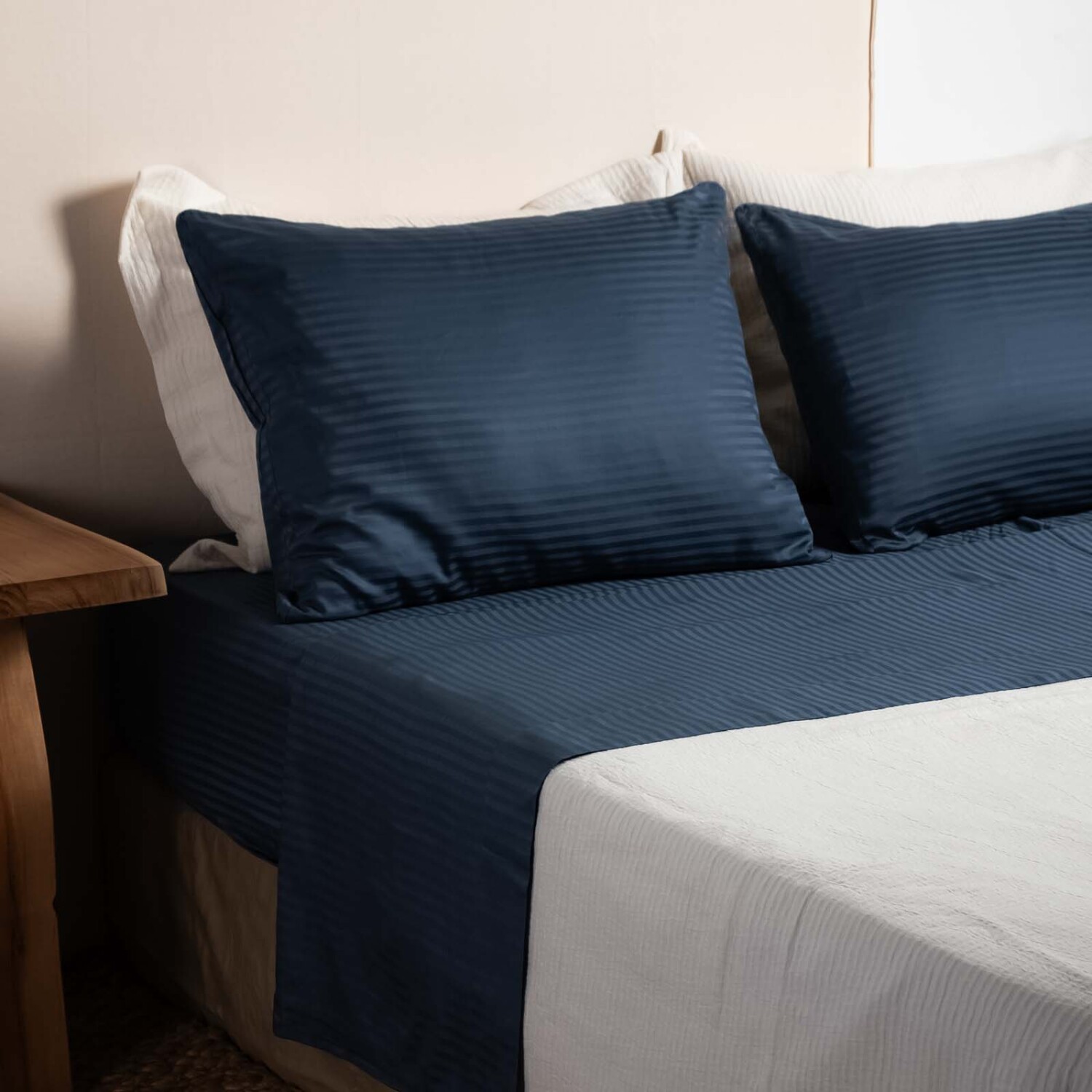 "Juego de sábanas 100% algodón 300 hilos. Incluye sábana bajera, sábana encimera y funda de almohada. 1 Plaza: sábana bajera de 190x90x38cm, sábana encimera 240x160cm y 1 funda de almohada 50x70cm. 2 Plazas: sábana bajera de 190x140x38cm, sábana encimera 250x240cm y 2 fundas de almohadas de 50x70cm. Queen: sábana bajera de 200x160x38cm, sábana encimera 260x260cm y 2 fundas de almohada de 50x70cm. King: sábana bajera de 200x180x38cm, sábana encimera 260x280cm y 2 fundas de almohadas 50x90cm. Super King: sábana bajera de 200x200x38cm, sábana encimera 270x300cm y 2 fundas de almohadas 50x90cm."
