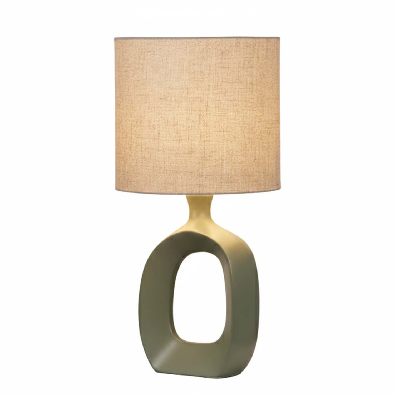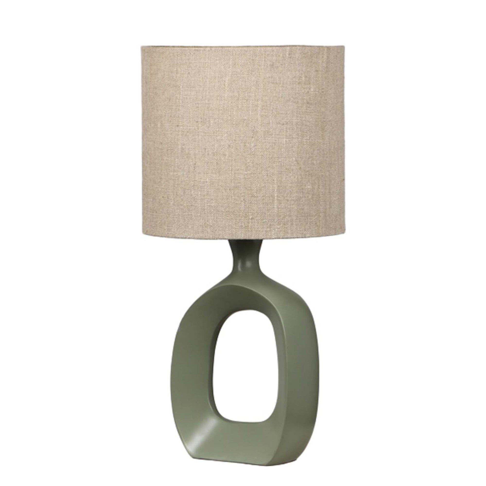 Lámpara de mesa con base de metal en acabado en color crudo o verde palta, y pantalla cilíndrica de lino en color natural. Un diseño moderno y elegante que aporta calidez y sofisticación a cualquier ambiente.