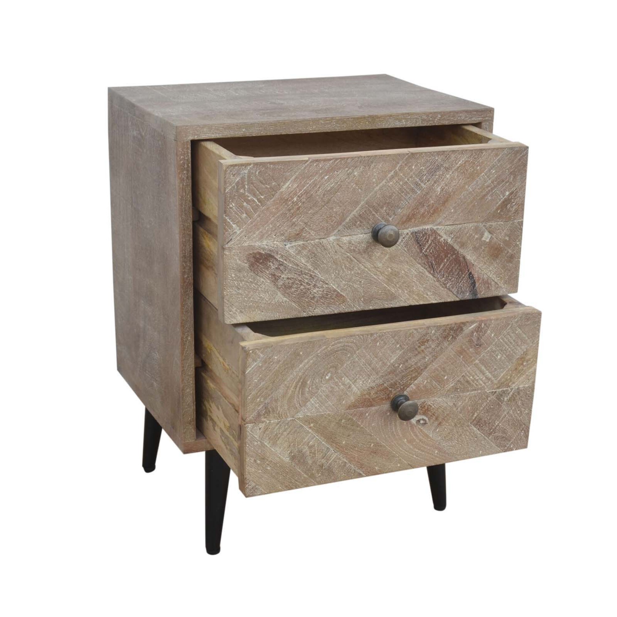 La mesa de luz ARETINA destaca por su encanto natural y su diseño sólido. Fabricada en madera maciza de mango y hierro, fusiona el estilo industrial con detalles románticos que aportan calidez. Su diseño cruzado en el frente y el tono natural de la madera realzan su estética artesanal. Equipada con dos prácticos cajones y una capacidad de carga de hasta 20 kg, es perfecta para guardar objetos personales y mantener tu dormitorio organizado sin perder estilo.