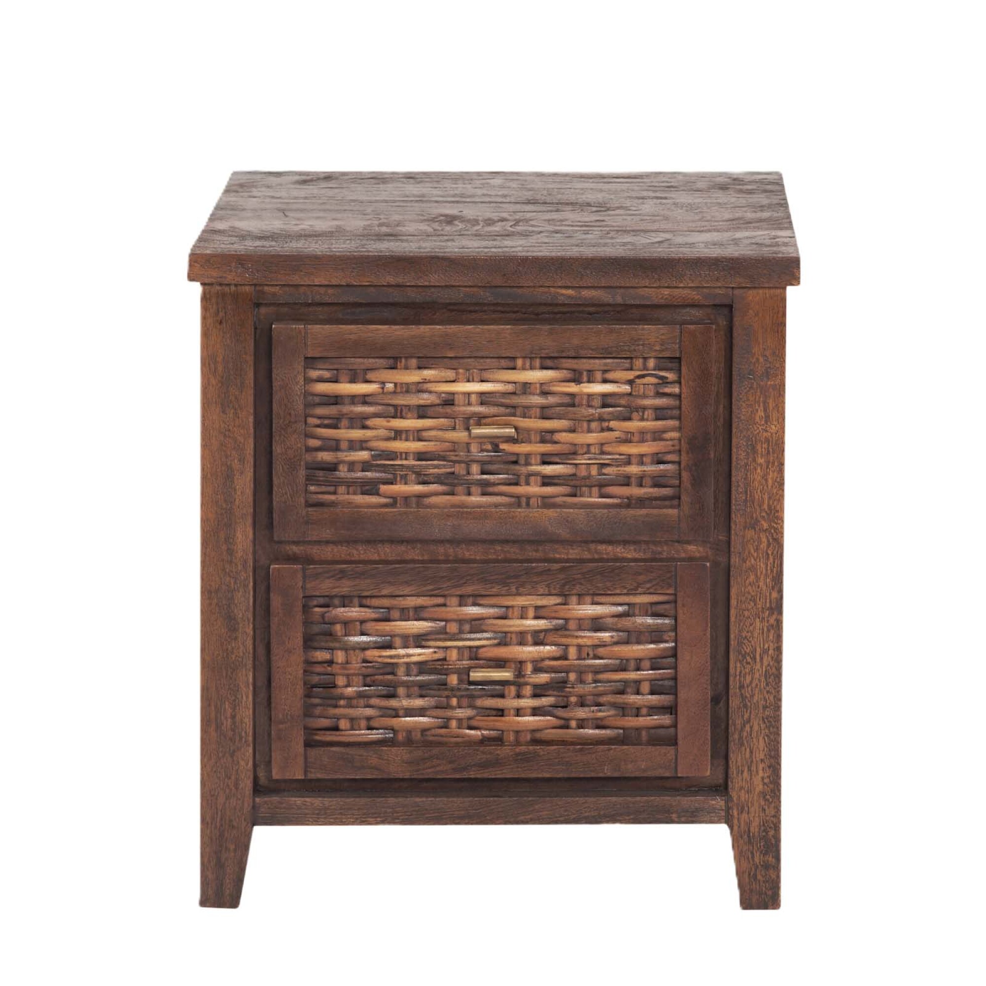 Mesa de luz con estructura en madera de mango en tono castaño oscuro, que destaca por su solidez y calidez. Sus cajones con frente de fibra natural trenzada aportan textura y un detalle artesanal que suma carácter al diseño. Funcional y decorativa a la vez, ofrece práctico espacio de guardado sin perder ligereza visual. Ideal para dormitorios de estilo natural y acogedor, donde los materiales nobles y los detalles hechos a mano marcan la diferencia.