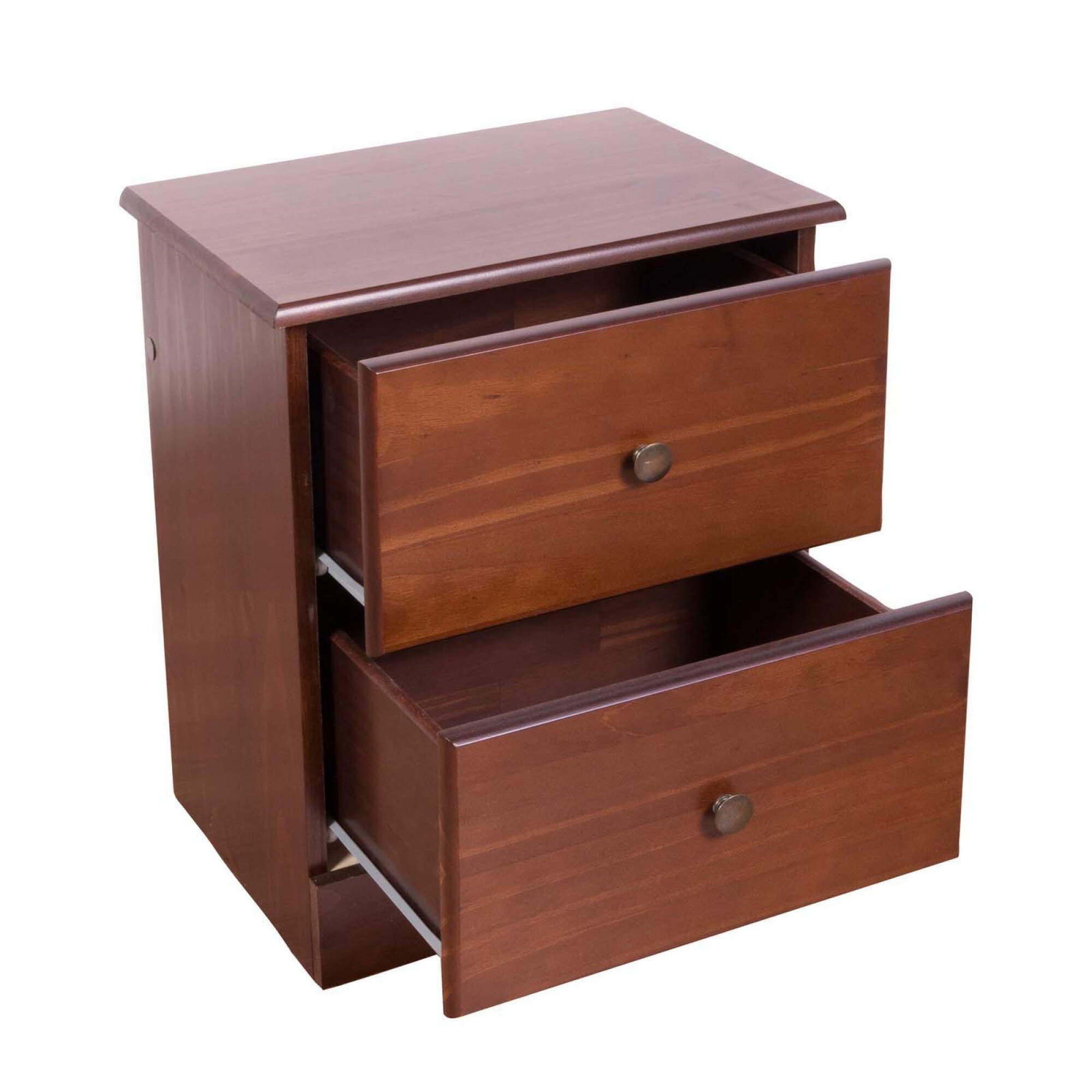 La mesa de luz Agata II Nogal es una mesa de luz de estilo tradicional, fabricada en madera maciza de pino, que aporta solidez y calidez al dormitorio. Con medidas de 44 cm de largo, 55 cm de alto y 33 cm de ancho, ofrece un formato compacto y práctico para optimizar el espacio. Sus 2 cajones con rieles y tiradores metálicos facilitan un deslizamiento suave y un acceso ordenado a tus objetos personales. El acabado en color nogal realza la veta de la madera y combina con diferentes muebles de dormitorio, incluyendo el resto de la línea Agata con camas, respaldo, placares, cómoda y zapatera, logrando un ambiente armonioso que invita a elegirla para completar tu espacio.