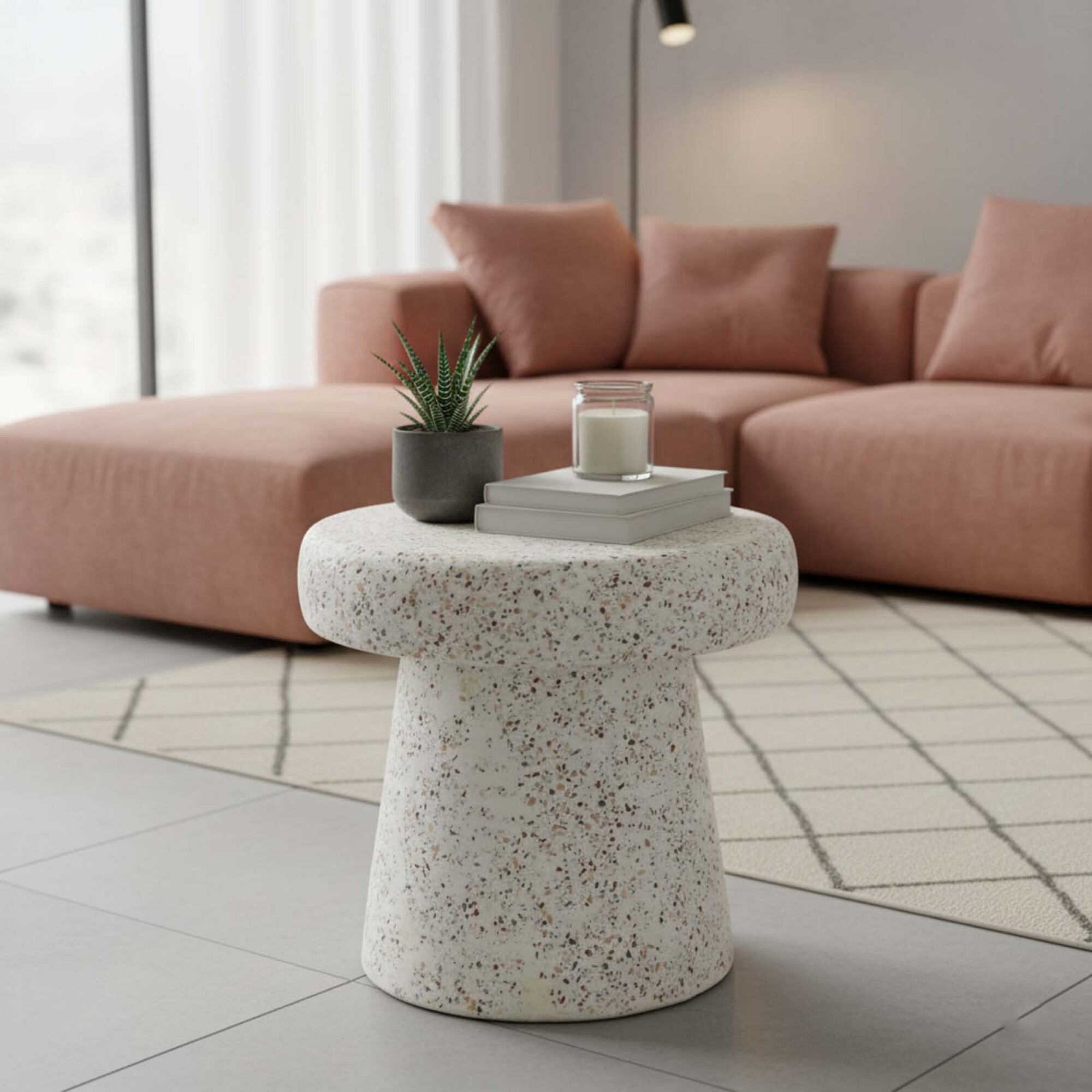 Su diseño moderno y creativo la convierte en una mesa de noche, mesa de esquina o mesa de centro, ideal para apartamentos y espacios pequeños. Compacta pero funcional, ofrece una superficie resistente y elegante para colocar tus objetos esenciales. Metal revestido con terrazo