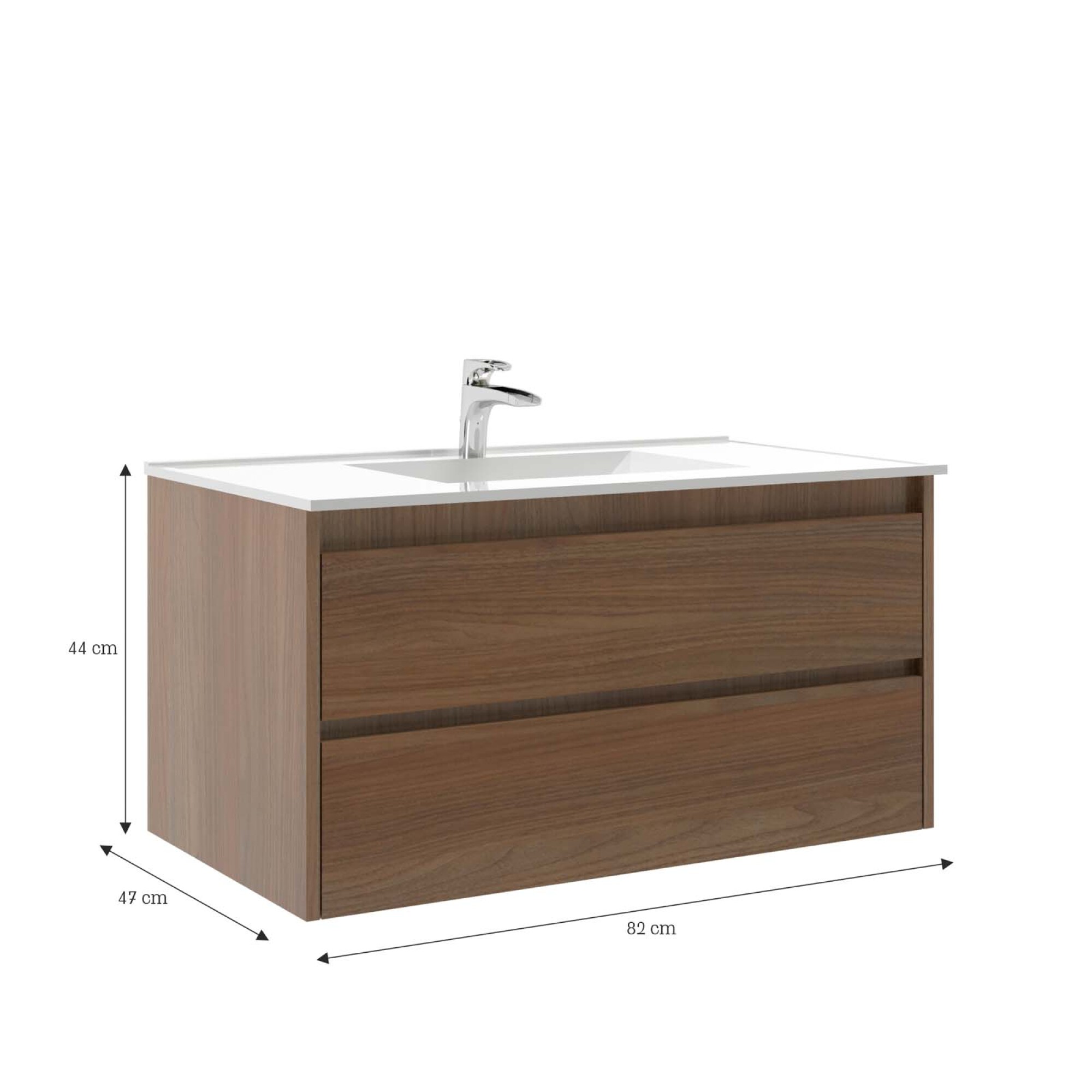 Mueble de baño fabricado en MDF de 15 mm, con diseño sin tiradores. Incorpora lavado de cerámica, riéles telescópicos y bisagras con amortiguación. Cuenta con 2 cajones, ofreciendo una distribución práctica y funcional para el uso diario.