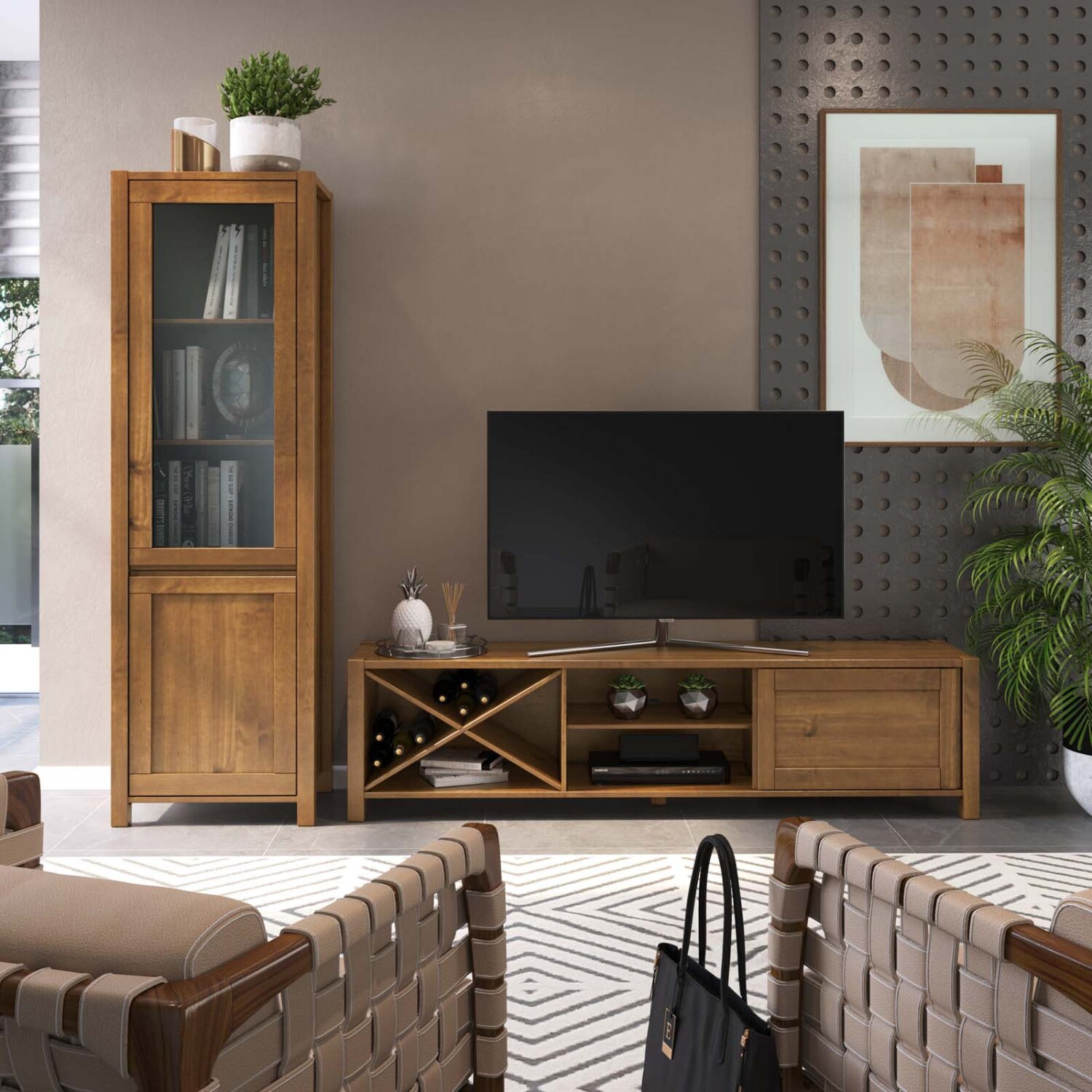El mueble para tv madera marrón Toledo caramelo, en color caramelo, aporta una presencia cálida que ordena visualmente el living y se integra con naturalidad tanto al mueble de tv como al resto del mueble para living. Su estructura en madera de pino ofrece una base firme, con sector dedicado para botellas de vino, compartimentos cerrados para guardar objetos y superficie superior amplia para apoyar decoración o equipos, soportando hasta 30 kg. Incluye herrajes para un armado correcto y requiere montaje previo para asegurar estabilidad y durabilidad en el uso diario.
