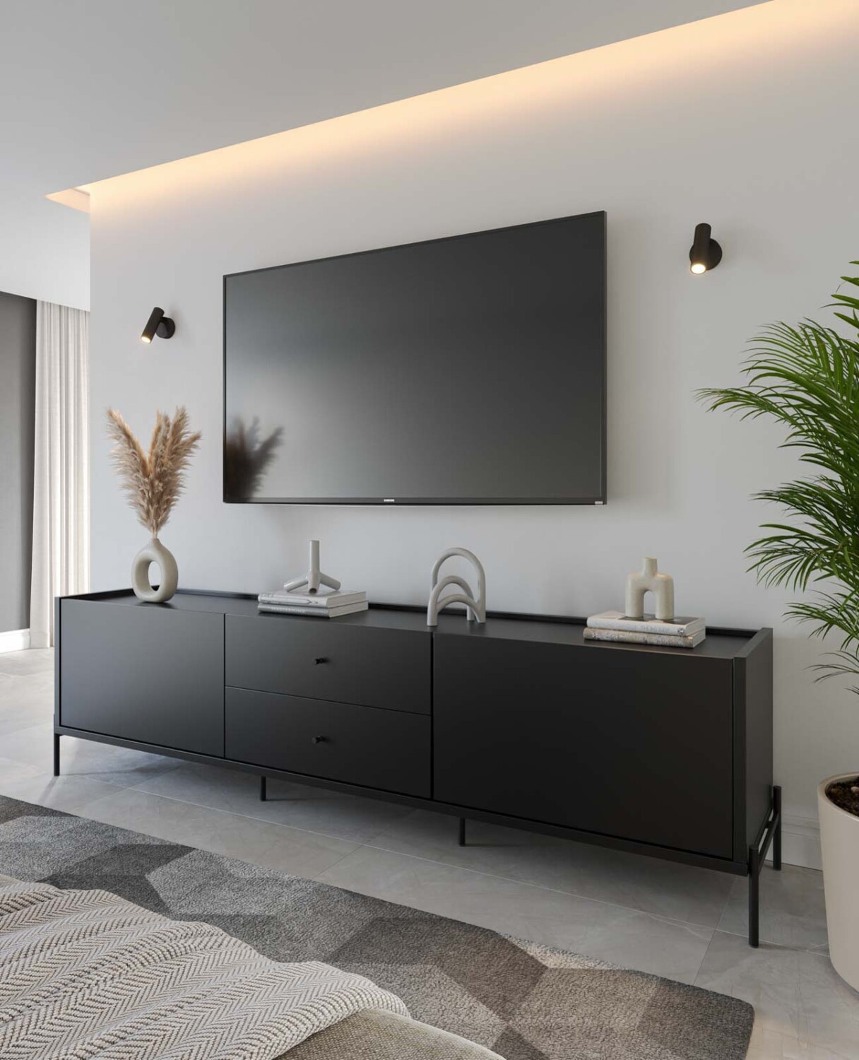 El mueble para tv mdf negro Jasper, en color negro, aporta una presencia equilibrada que mantiene la zona de pantallas limpia y continua, integrándose con facilidad a distintos recursos decorativos del living. Su estructura combina mdf, mdp y acero carbono en una base firme que asegura estabilidad y un uso confiable a diario, con superficie superior preparada para equipos de gran tamaño y peso. Internamente distribuye estantes y compartimentos pensados para dispositivos y accesorios, soporta hasta 40 kg y se adapta tanto como mueble de tv como mueble para living, manteniendo una proporción adecuada frente al sofá y al resto del ambiente.
