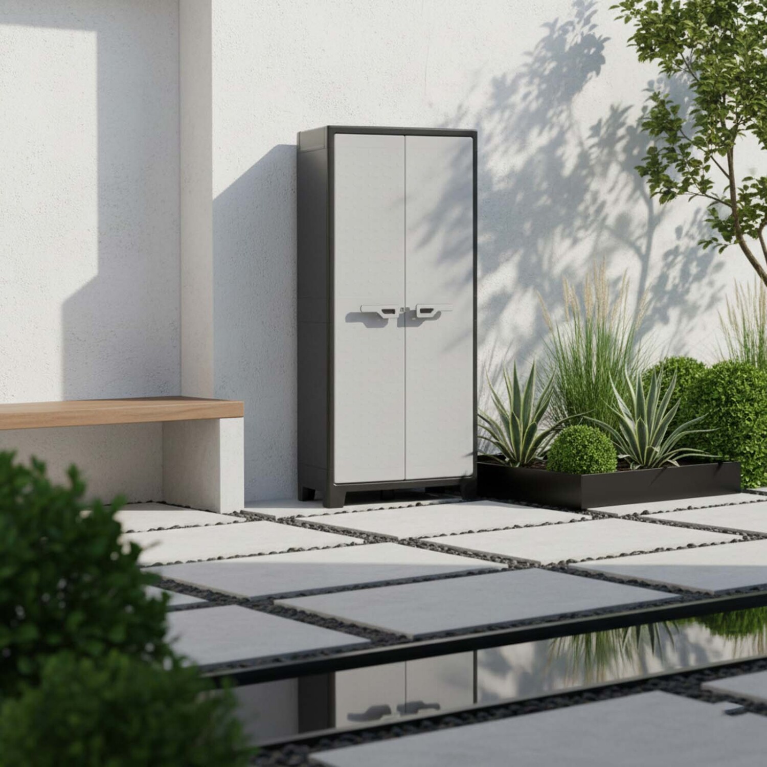 Armario multiuso Keter de la línea TITAN, fabricado con más de un 70% de plástico reciclado. Incluye 8 estantes ajustables que soportan hasta 15kg cada uno, lo que permite el almacenamiento de objetos de distinto tamaño y altura. Resistente al agua (Con certificación IPX3) y viento, herrajes de metal, certificado TUV GS. La resistencia a la lluvia, el fondo reforzado y el cierre con preparación para candado (no incluido) proporcionan la máxima seguridad. Una excelente solución de almacenamiento que combina diseño y funcionalidad. De fácil limpieza y montaje.