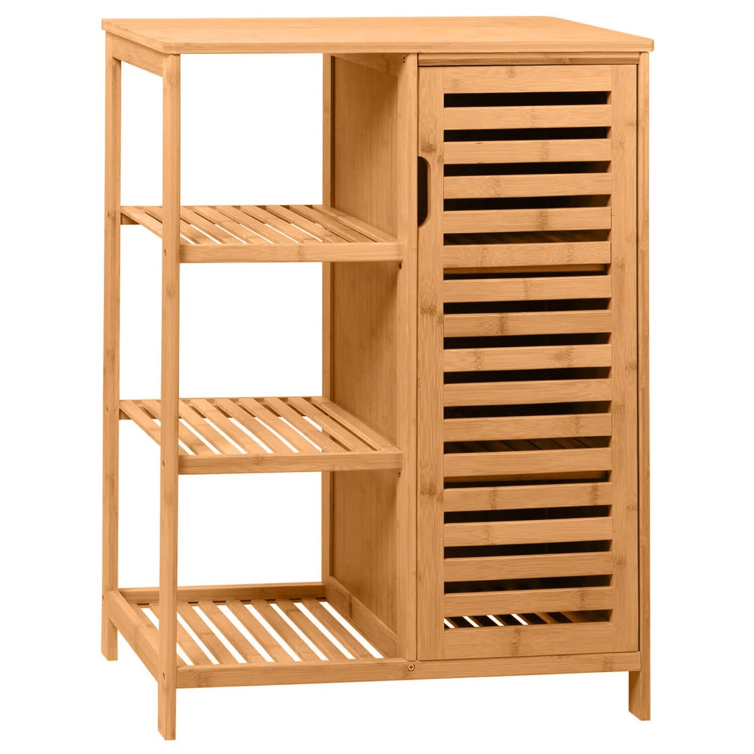 Mueble multiuso de baño/lavandería o cocina en madera de bambú con estantes y espacio de guardado.