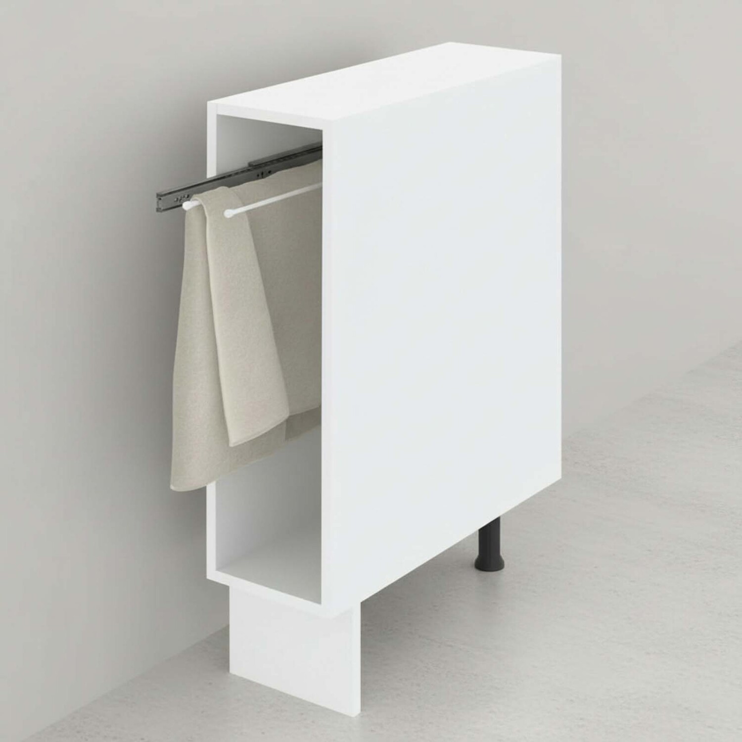 Nicho de cocina con riel telecópico para colgar textiles, ocupa 20cm de ancho fabricado en MDP de 15mm con acabado en pintura poliester de alta resistencia. Incluye zócalo, no incluye tapa. Apto para mesadas de granito o silestone.