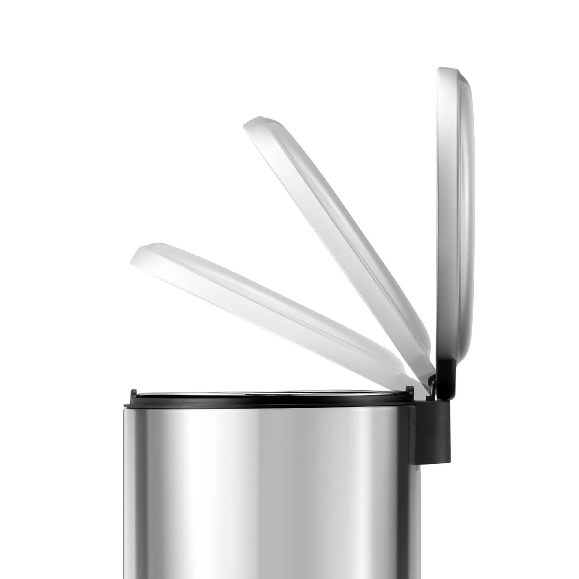Papelera de pedal. Tapa y cuerpo de acero inoxidable antihuellas o cuerpo con recubrimiento en polvo Cierre suave con función de tapa abierta Mecanismo de pedal completamente metálico Base antideslizante Cubo interior negro de polipropileno con fijador de bolsa