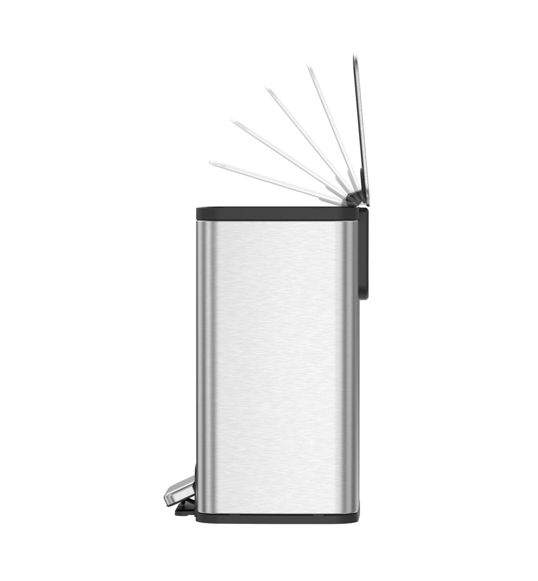 Papelera de pedal Marina de 11 litros Tapa de cierre suave y silencioso Función de tapa abierta para mayor comodidad Superficie resistente a huellas dactilares Mecanismo de pedal con sistema de brazo oscilante, duradero y eficiente Estabilizador de bolsa interior de plástico Disponible en colores: metálico mate, vainilla y acero inoxidable negro mate