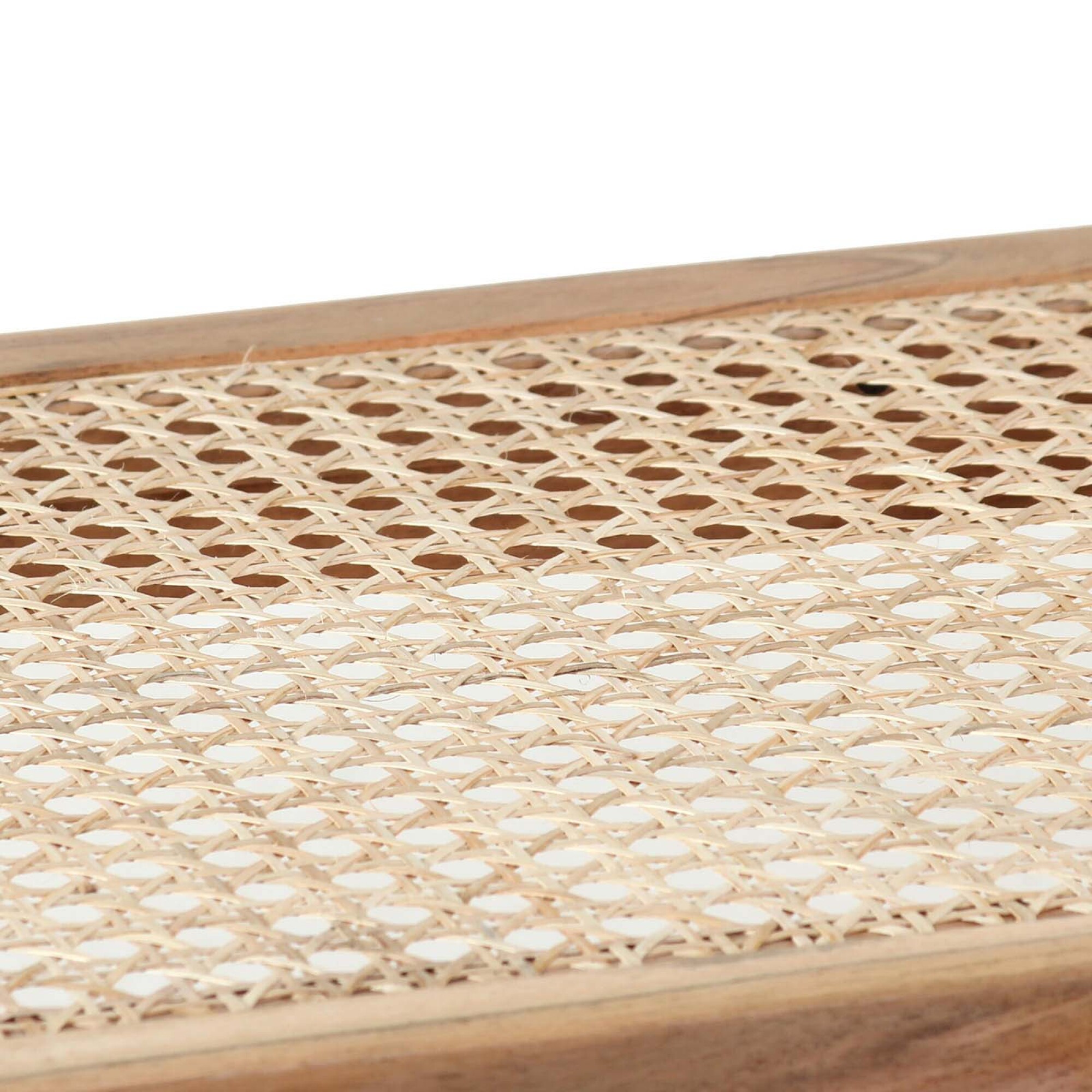 El pie de cama en madera acacia natural/beige Ema, es ideal como pie de cama o banqueta, fabricado en madera de Acacia en color natural con esterilla de caña, que aporta un toque elegante y atemporal al dormitorio. Sus medidas de 116 cm de largo, 40 cm de ancho y 45 cm de alto ofrecen una superficie cómoda para sentarse o apoyar prendas y accesorios, optimizando el espacio con estilo. La estructura en madera maciza garantiza firmeza y buena resistencia, mientras que el diseño delicado de la esterilla suma ligereza visual y practicidad, creando un ambiente armonioso y refinado que invita a incorporarlo como pieza clave en la decoración del dormitorio.