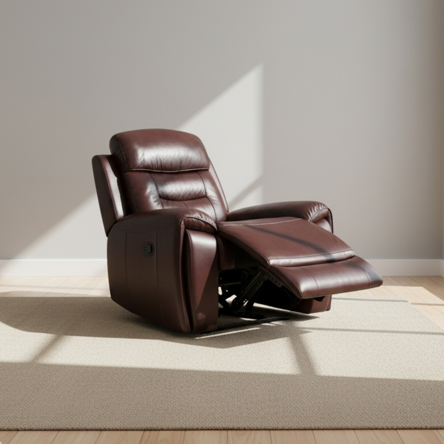 Sofa reclinable mecedor de un cuerpo, tapizado en cuero con laterales y traseras en simil cuero. Reclina tanto el respaldo como el apoyapies. Relleno de espuma de alta densidad y resortes espirales. El peso máximo resistido por asiento es de 120 kg. 50cm de altura del piso al asiento. MANTENIMIENTO: - No exponer a luz solar directa ni a fuentes de calor - No utilizar productos a base de solventes o cualquier otro producto abrasivo - La utilización de productos de limpieza inadecuados puede resecar el cuero y causar daños irreparables LIMPIEZA: - Líquidos deben ser removidos inmediatamente con un paño seco - Limpieza regular debe ser efectuada con un paño seco limpio - Para suciedades más severas utilizar un paño limpio humedecido en agua y jabón neutro