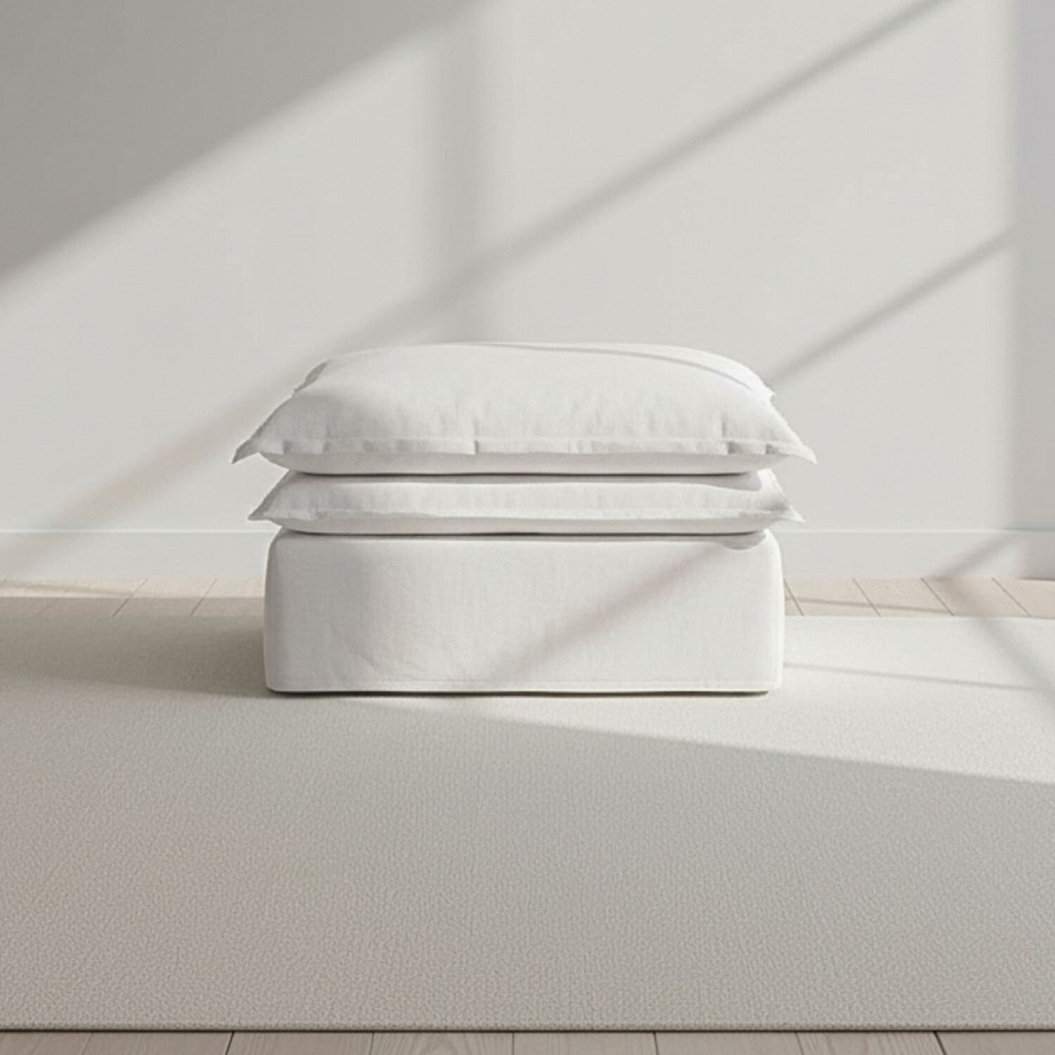 Puff confeccionado en tela premium. Material de la estructura hecho en madera, con espuma densidad 29 + espuma densidad 23 + espuma densidad 12 + pluma, fibra poliester en manta, almohadas rellenas de fibra siliconada + espuma, cintas y resortes espirales.