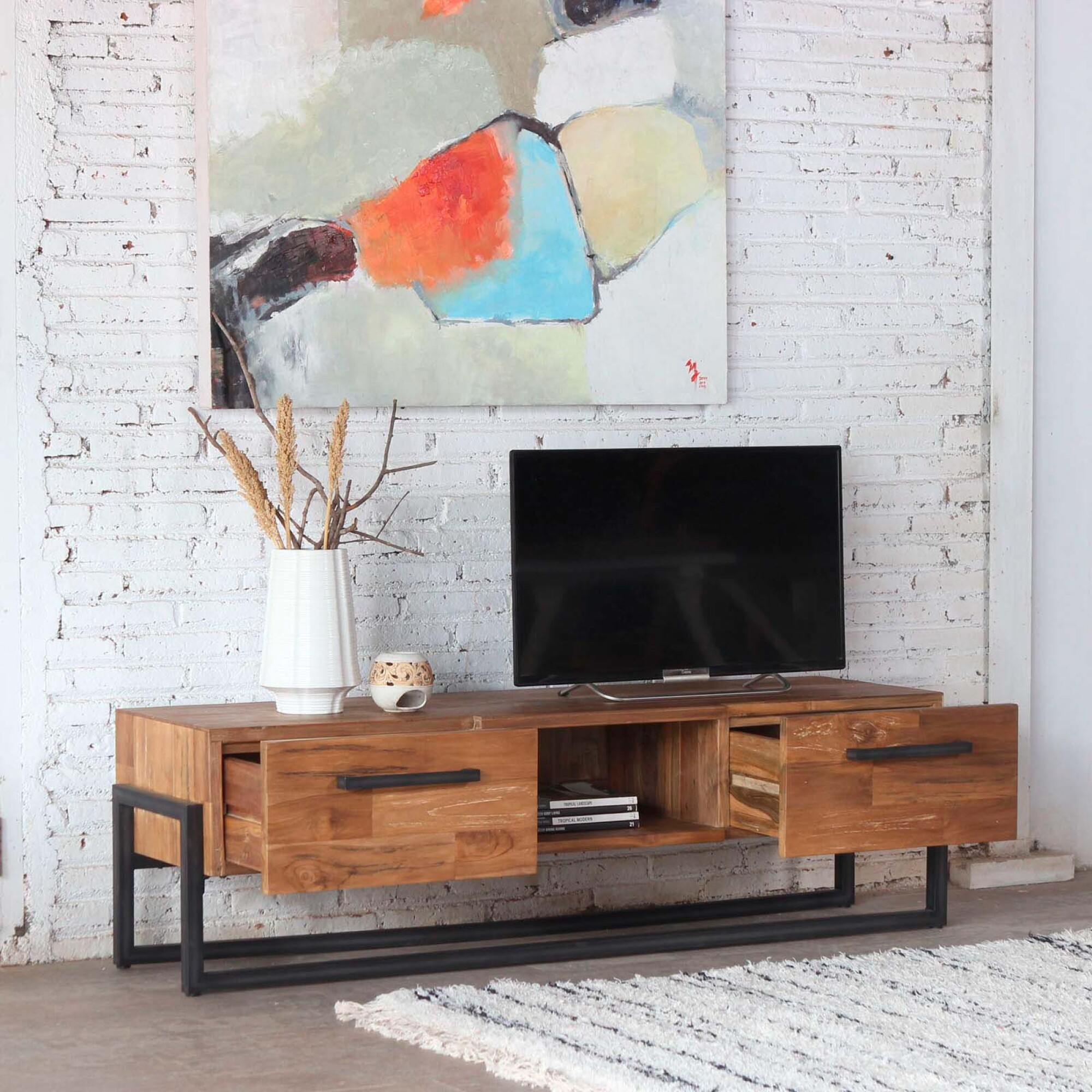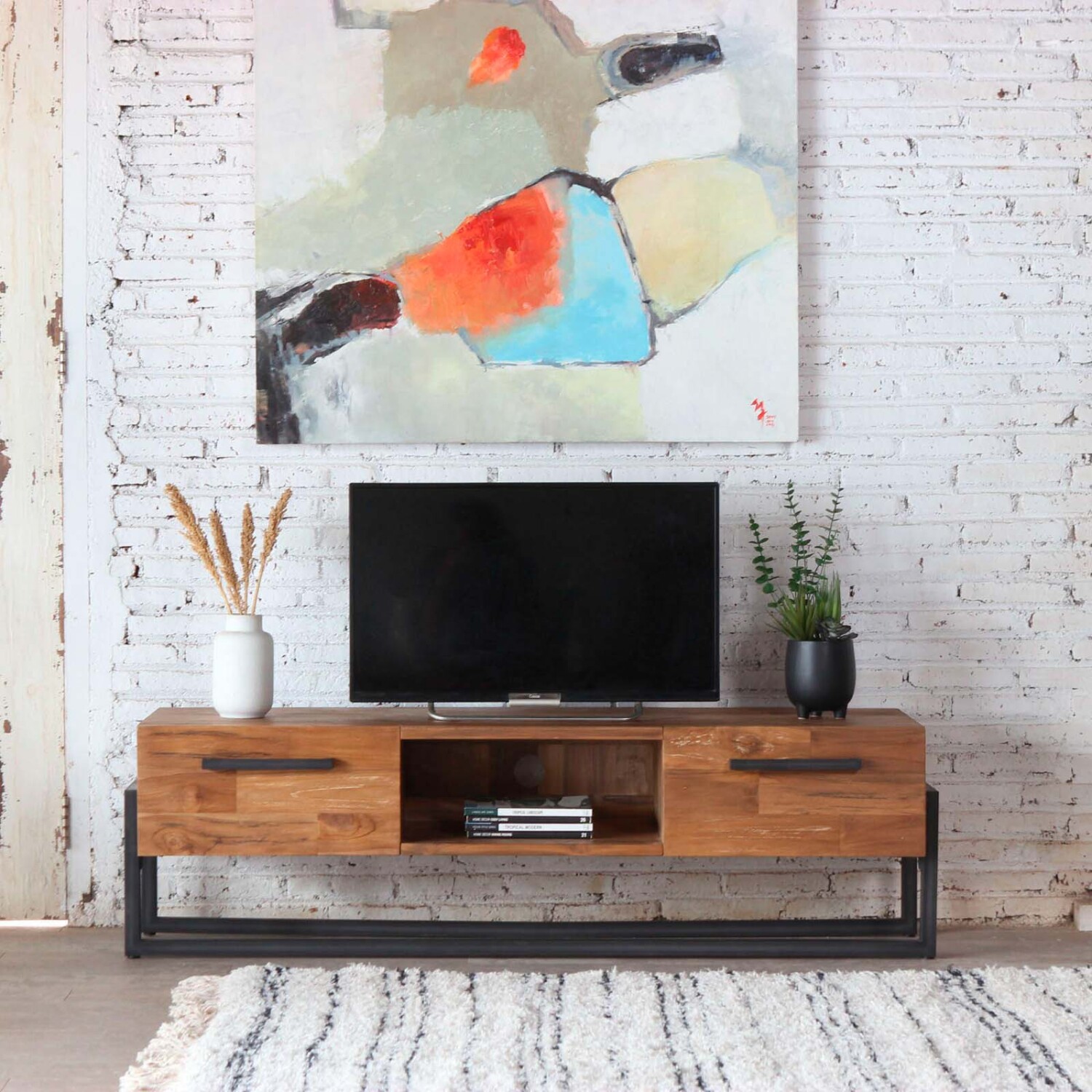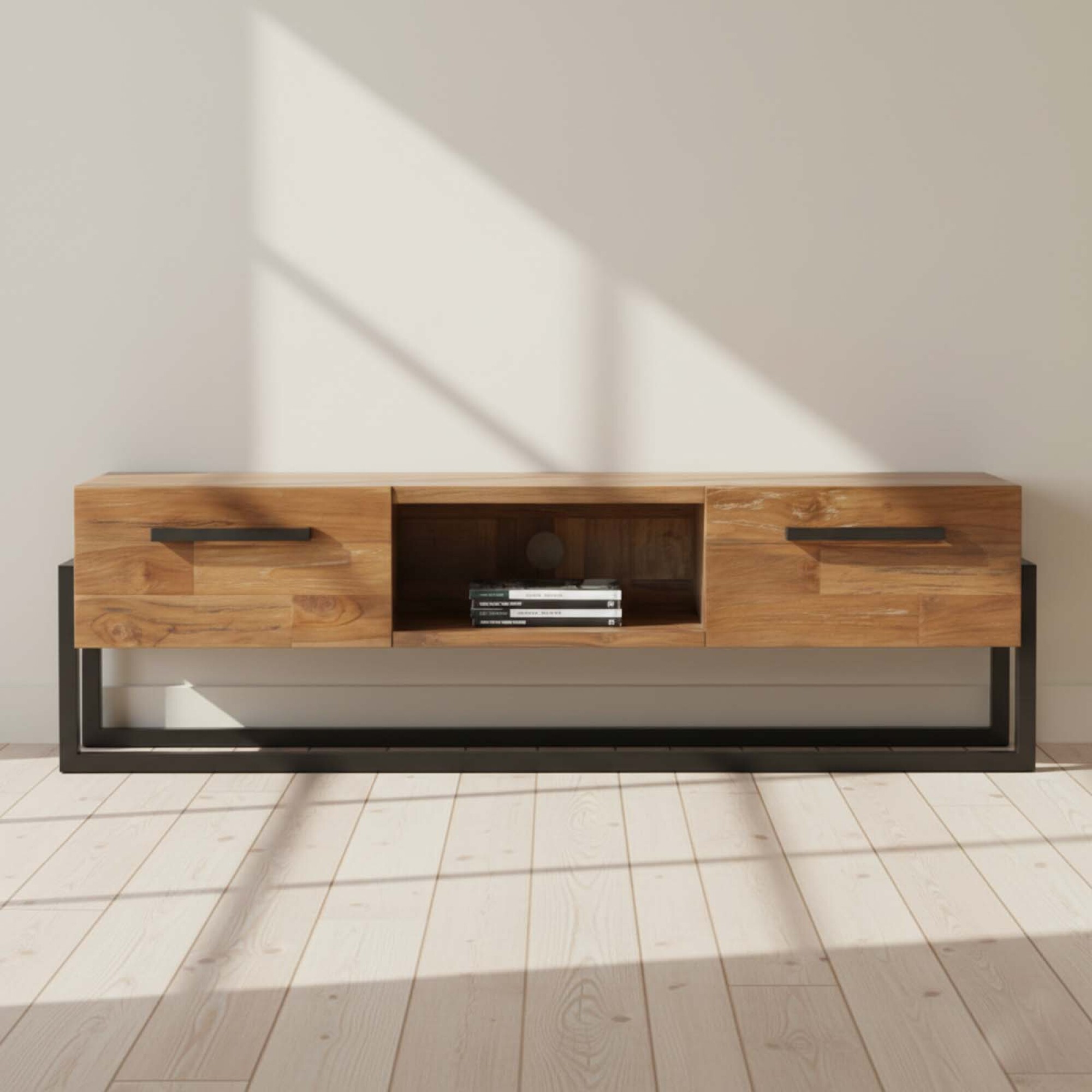 Rack Madera Natural/beige Potenza, en color natural, se integra con facilidad al living y aporta una presencia equilibrada que aligera la pared de la televisión sin recargar el ambiente, manteniendo una línea limpia que combina con diferentes sofás, mesas bajas y módulos de guardado. Fabricado en madera de teka reciclada con acabado en lámina de madera, presenta una estructura firme de 1,56 m de largo, pensada como mueble de tv y mueble para living en clave industrial, con base sólida, espacio para equipos y accesorios, distribución interna bien resuelta y capacidad de apoyo estable para pantallas y objetos de uso diario.