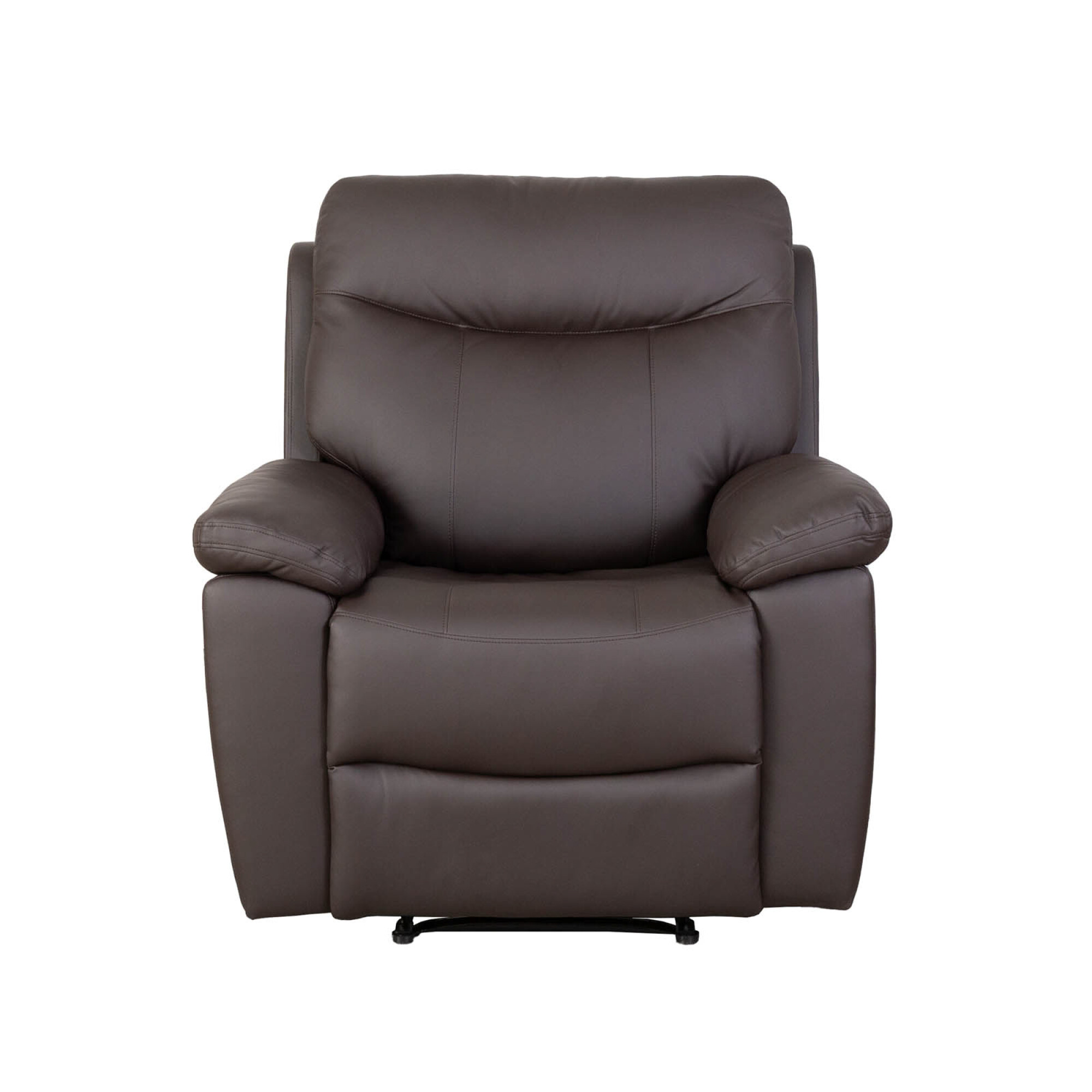 Recliner manual individual, tapizado en simil cuero. Reclina tanto respaldo como apoyapies. Gatillo al costado del asiento. 49cm de altura del piso al asiento MANTENIMIENTO: - No exponer a luz solar directa ni a fuentes de calor - No utilizar productos a base de solventes o cualquier otro producto abrasivo - La utilización de productos de limpieza inadecuados puede resecar el cuero y causar daños irreparables. LIMPIEZA: - Líquidos deben ser removidos inmediatamente con un paño seco - Limpieza regular debe ser efectuada con un paño seco limpio - Para suciedades más severas utilizar un paño limpio humedecido en agua y jabón neutro.